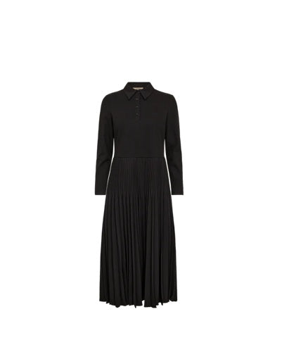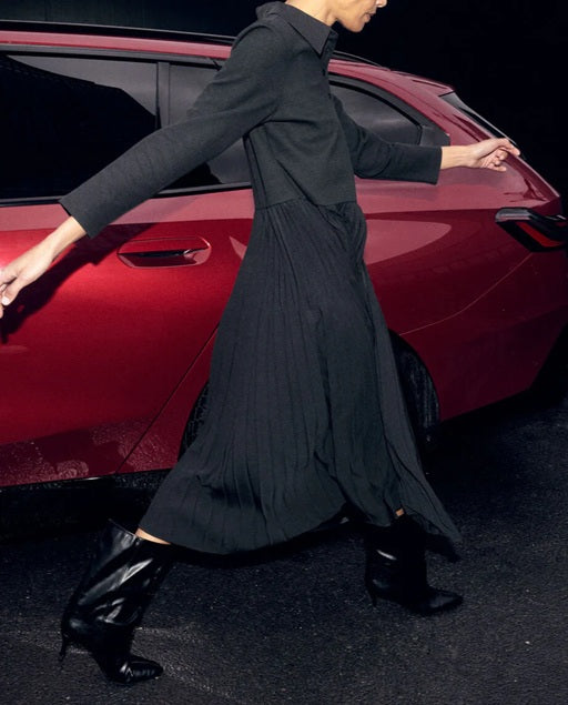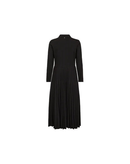 Style Details: The Maike Black Pleat Dress is crafted with a classic shirt collar, a refined button closure down to the chest, the pleated waist detail adds graceful movement, enhancing the silhouette with a sophisticated touch. Pair it with sleek boots for a chic daytime look or style it with heels for an effortlessly polished evening outfit.