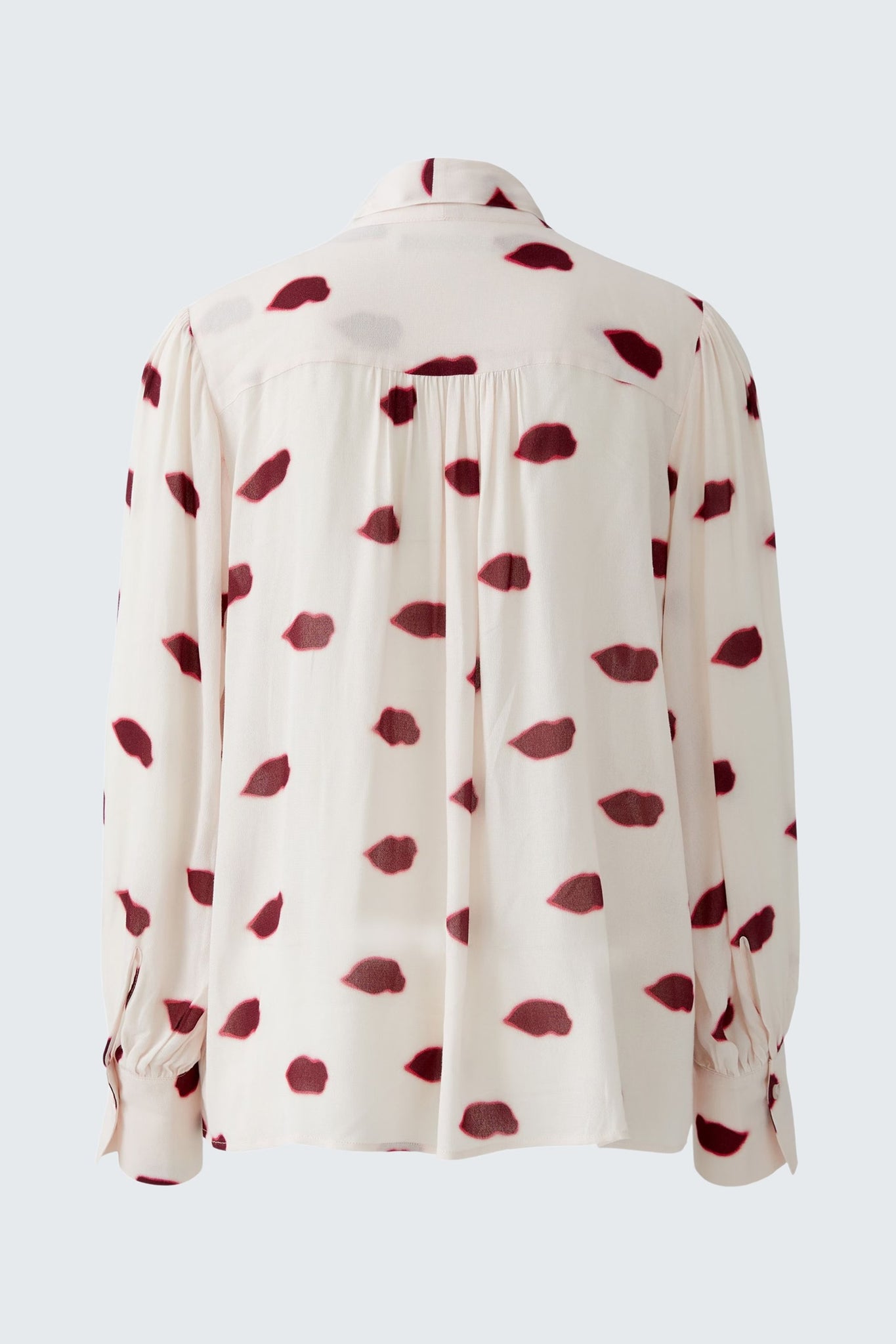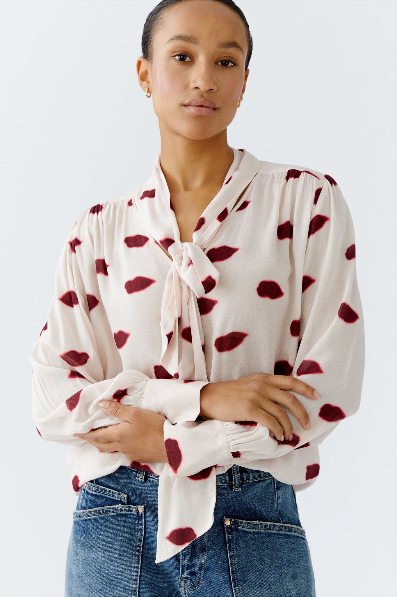 Style Details: Turn heads with effortless versatility in this viscose blouse, designed to offer three distinct wearing styles for every mood and occasion! Crafted from semi-transparent viscose crepe, it features an all-over kissable lips print that adds playful sophistication to its fluid silhouette, straight cut, regular length, V-neck with an adaptable bow tie lets you wear it elegantly tied, long sleeves with buttoned cuffs and delicate gathers along the front and back shoulder yoke enhance the drape.