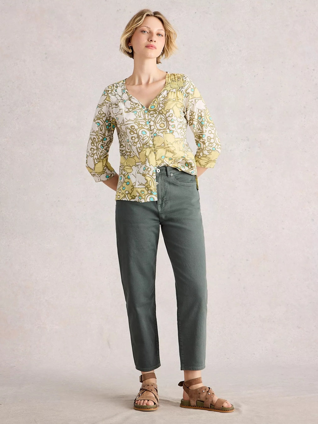 Style Details: Refresh your wardrobe with the Tilly Tapered Jean in a sophisticated mid green hue. Designed to flatter with a modern ankle-length cut, these jeans feature a classic 5-pocket silhouette, refined belt loops, and a sleek button-and-zip closure. The tapered fit offers a chic, tailored feel—perfect for pairing with everything from crisp blouses to laid-back knits. Effortlessly cool, endlessly versatile!