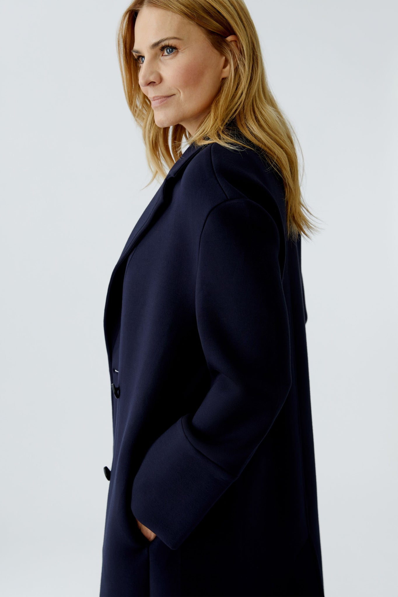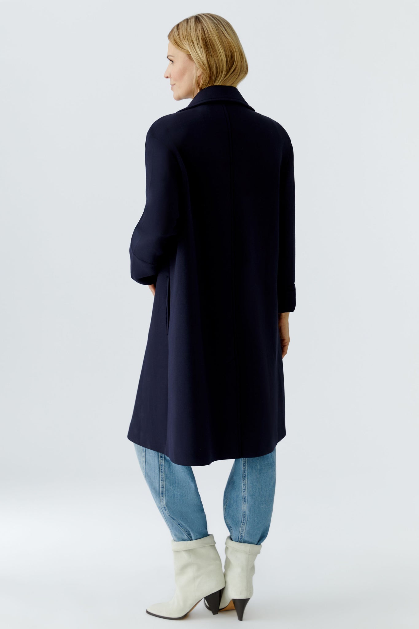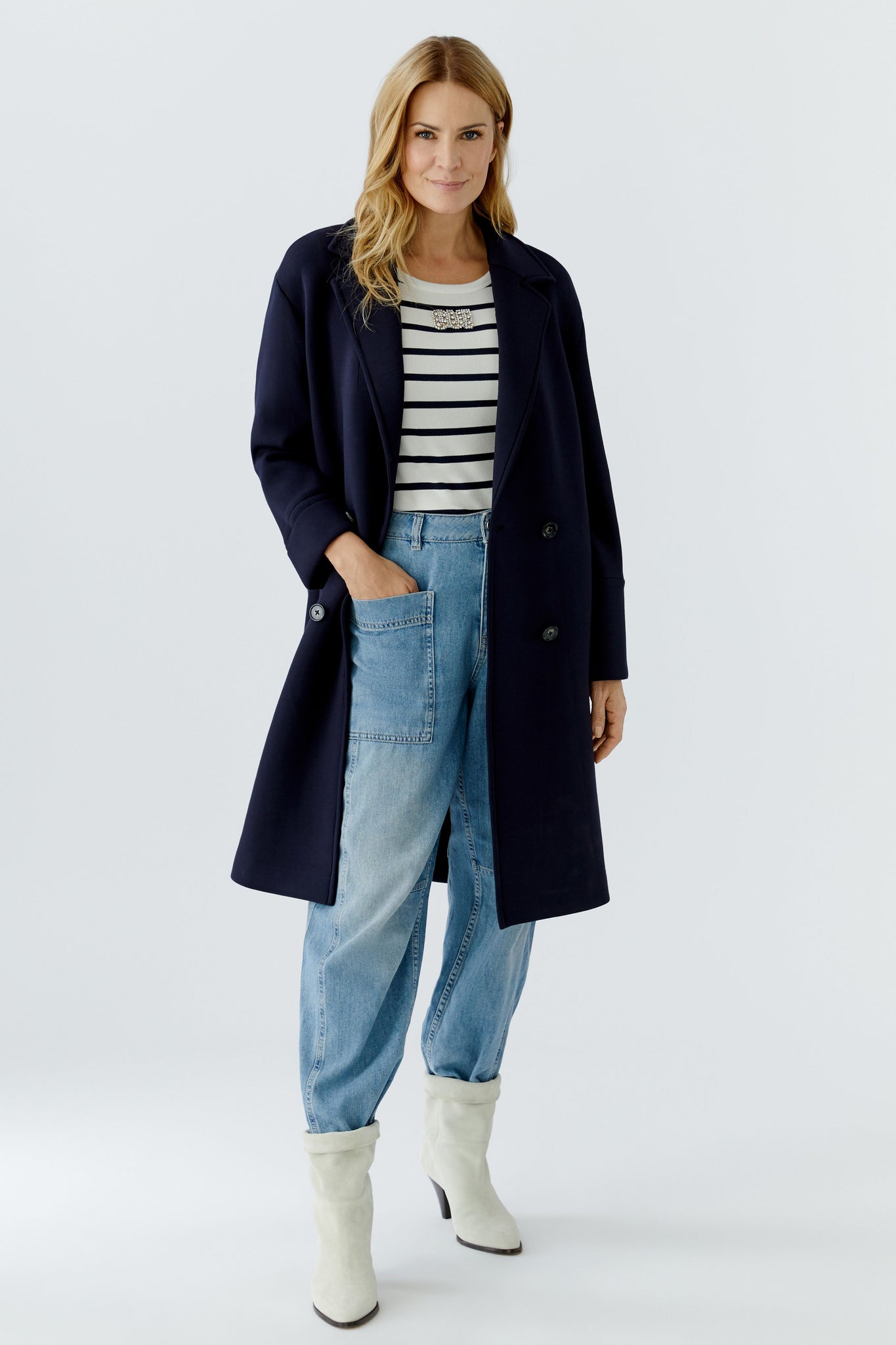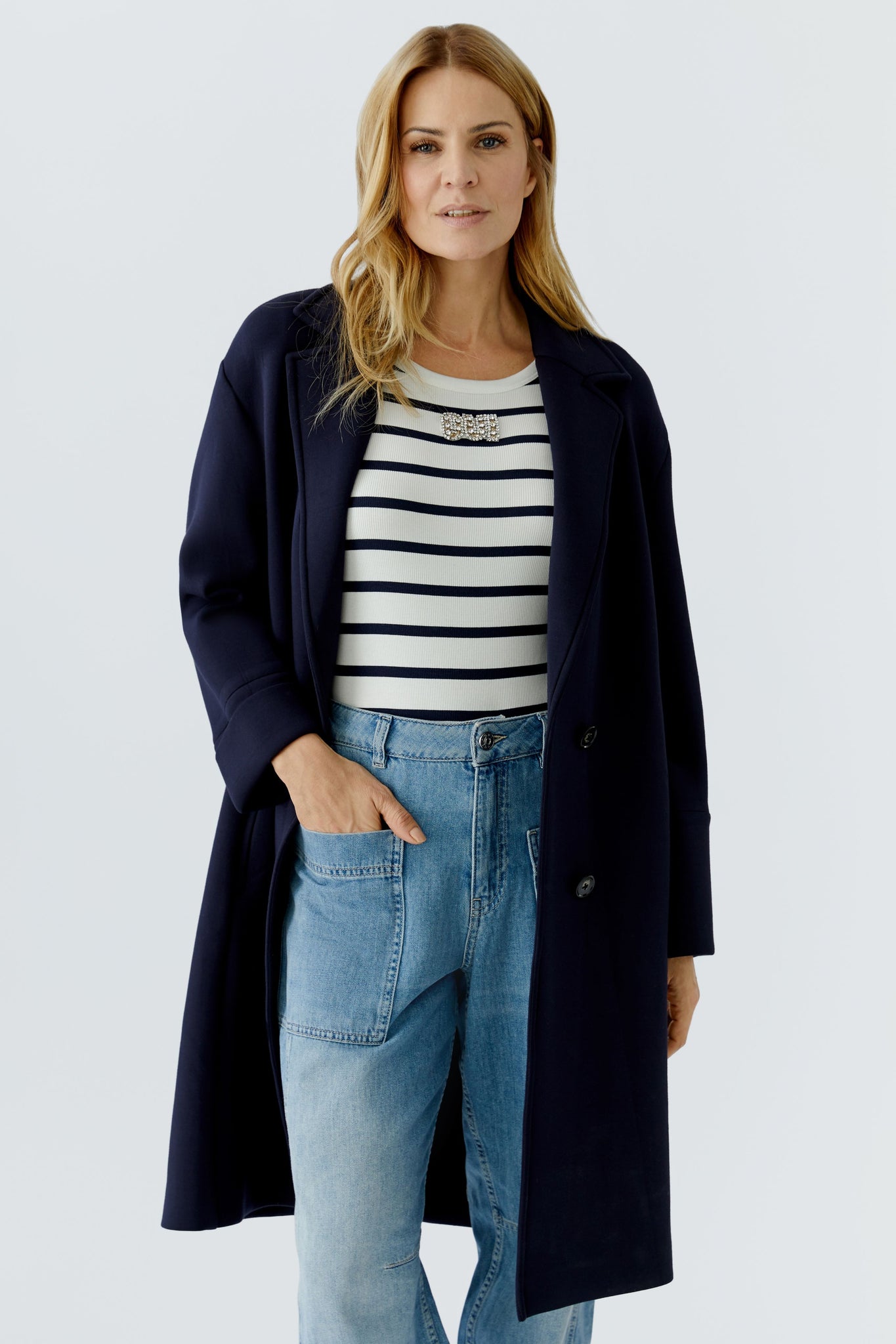 Style Details: Step out in effortless sophistication with this chic and comfortable navy jersey coat from Oui! Designed in a relaxed straight silhouette, features a timeless collar with elegant lapels, classic double-breasted button fastening, long sleeves, practical side seam pockets, a subtle back split for ease of movement, unlined. This coat is the perfect lightweight layering piece for any season!