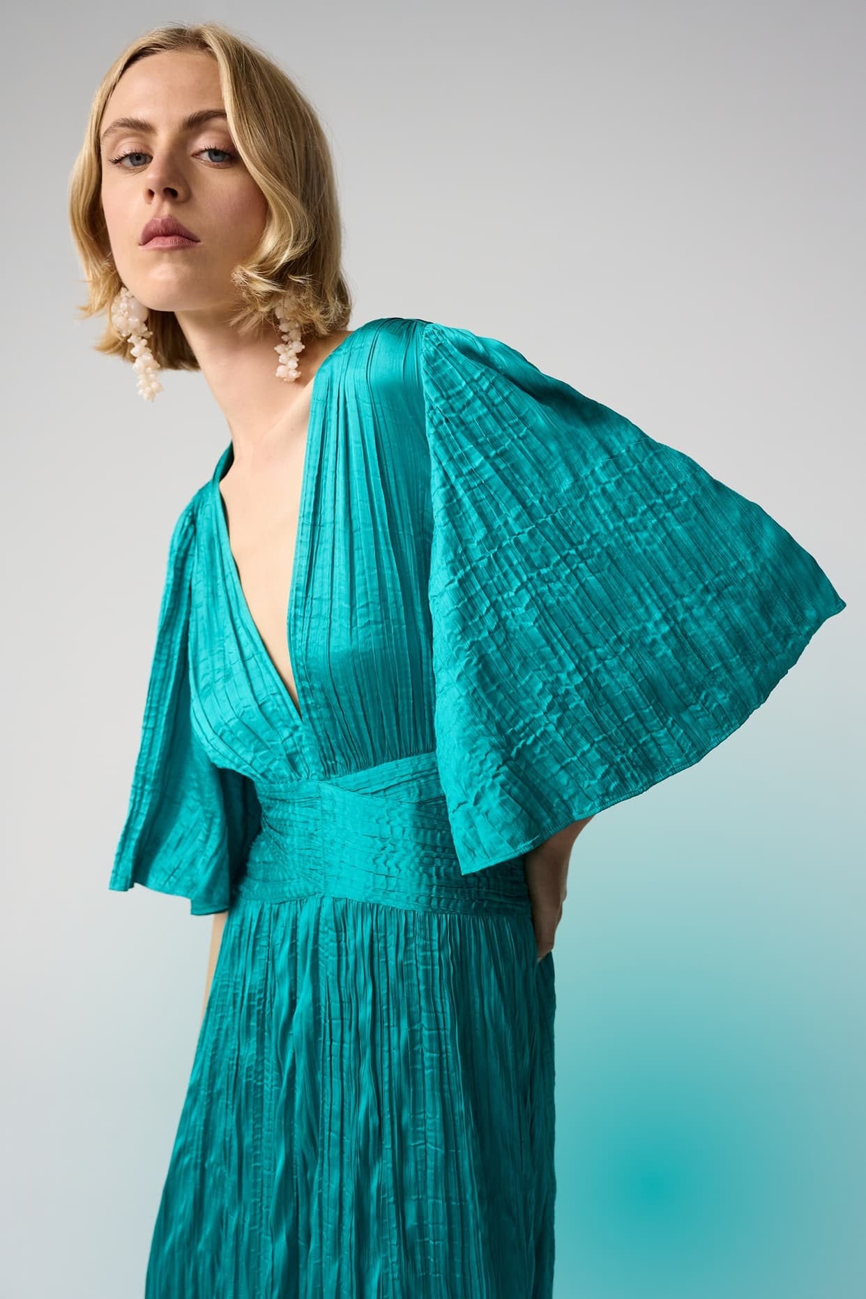 Style Details: Effortless elegance meets modern sophistication in this stunning pleated ocean dress by Joseph Ribkoff! Designed to flatter every curve, its fit-and-flare silhouette is accentuated by pleated knot waist details, flare elbow-length sleeves, back waist smocking, falling to a graceful midi length. Ideal for formal or semi-formal occasions where timeless style meets modern ease! Pair with heels and a statement clutch for a wedding event or the races.