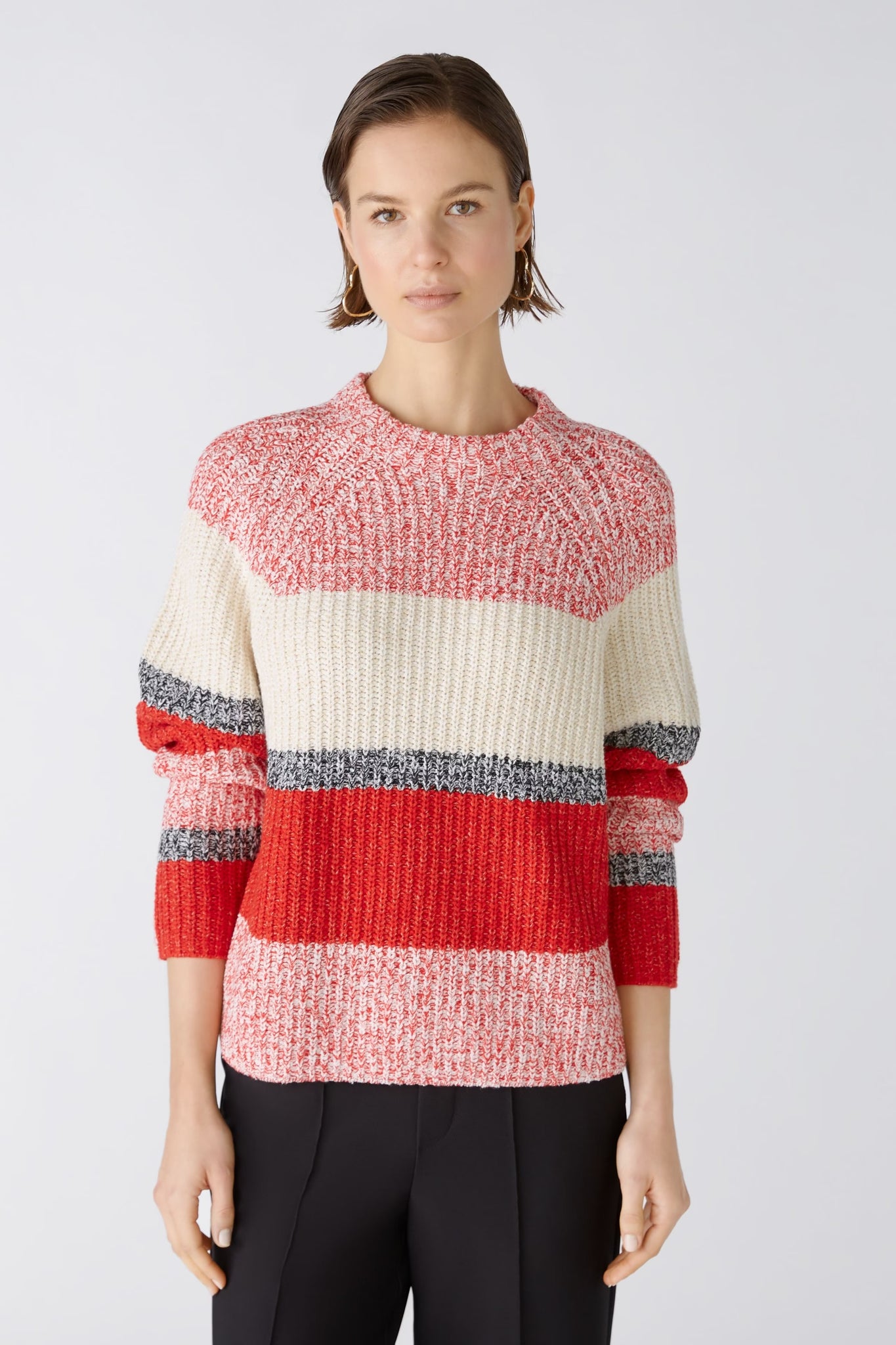 Style Details: This Oui knit striped sweater is a bold and modern take on casual chic! Designed with an oversized silhouette, a slightly cropped length, round neck, knitted collar that’s doubled inwards for an added touch of sophistication, raglan sleeves, the sleeve ends and hem are knitted more tightly for a refined finish. This sweater offers an effortless, laid-back vibe that can be paired with high-waisted jeans or skirts for a trendy look.