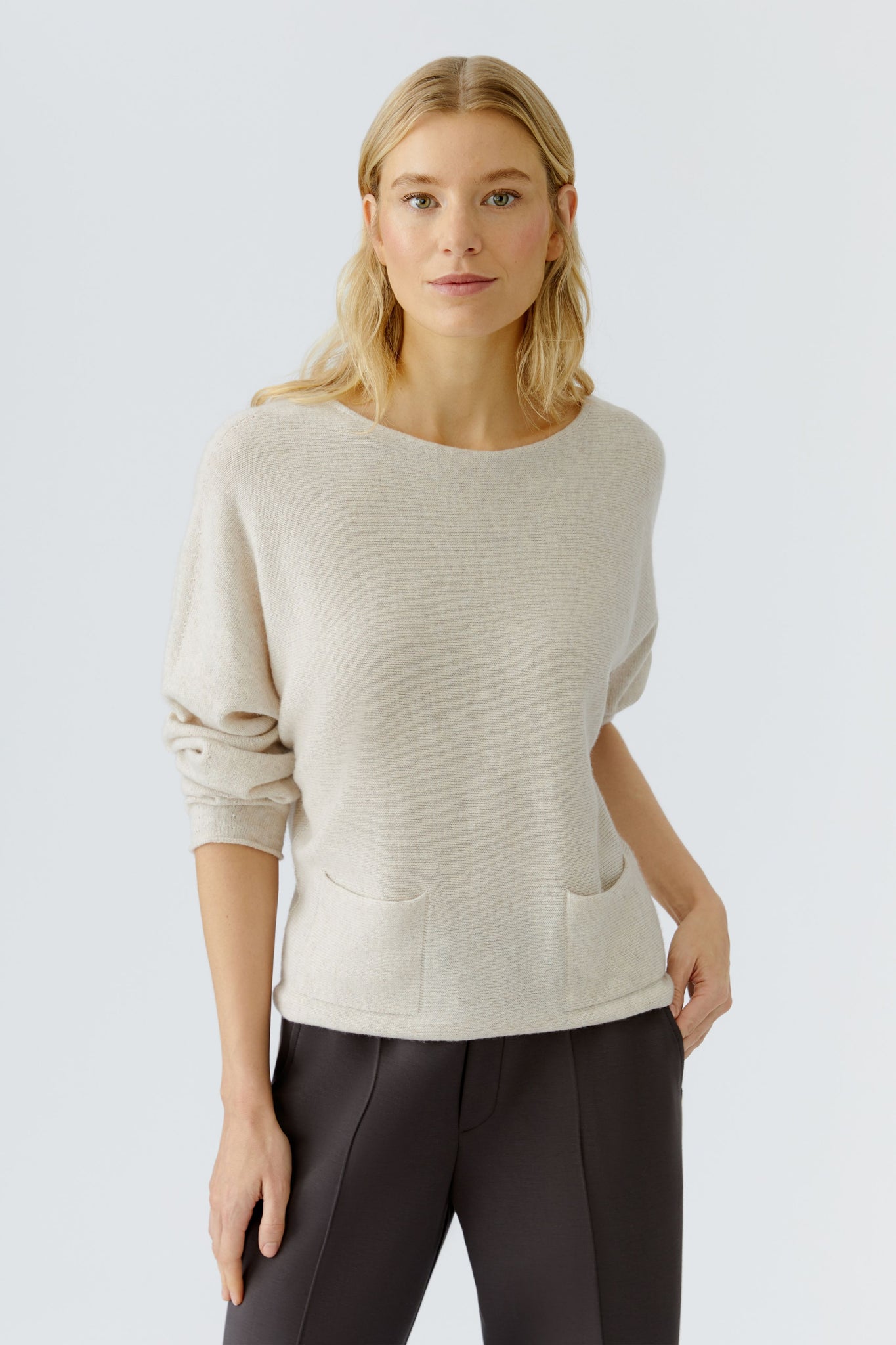 Style Details: Redefine effortless elegance with this fine-knit blue sweater by Oui. Designed in a seamless horizontal smooth knit that feels as refined as it looks, crafted from a soft wool blend with modal, it drapes beautifully in an oversized cut that tapers gracefully towards the hem for a flattering silhouette, a light boat neckline with a delicate rolled edge adds understated charm, while the cropped long sleeves and knitted-in pockets bring modern ease to the design. Timeless yet contemporary, this piece is a versatile staple for every wardrobe. *Please note: the colour of this jumper is Blue and not as shown in some images.