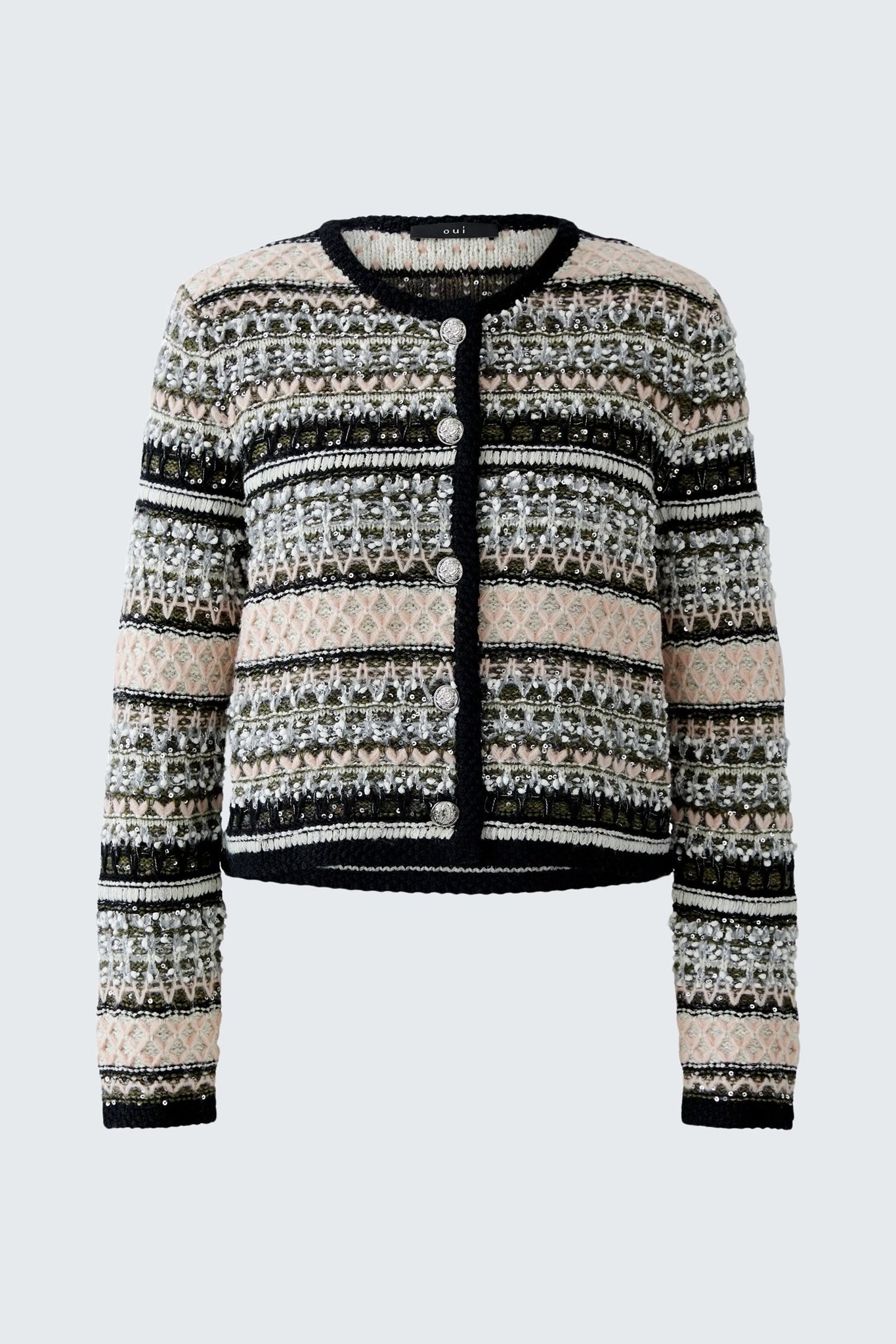Style Details: Make a bold yet elegant statement with this knit jacket by Oui! This textured jacquard jacket dazzles with subtle sequins and knotted fleece yarn, creating a captivating striped 3D effect, designed in a slim, cropped fit, it features a full-length button placket with crest-embossed buttons, refined rice-grain knit panels, and delicate shoulder pads for a perfectly structured silhouette. A harmonious blend of artistry, sophistication, and modern flair!