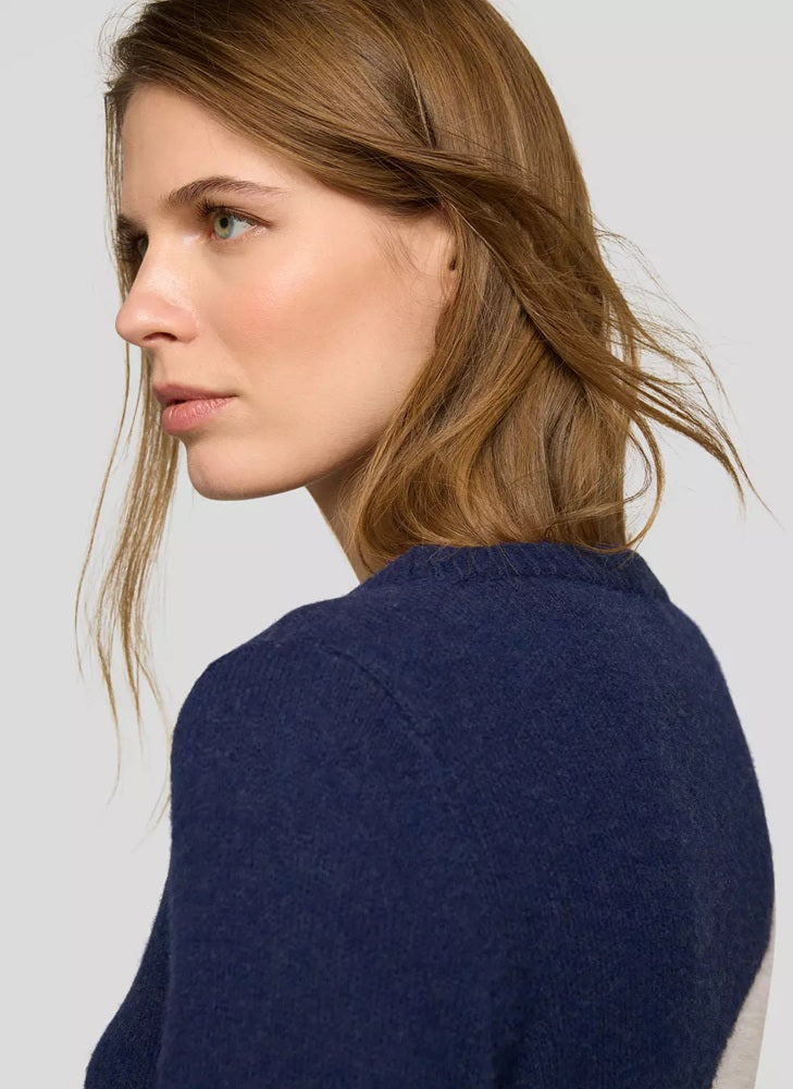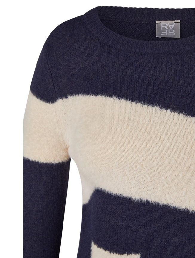 Style Details: Add timeless style with a modern twist in this knitted striped sweater by Rabe. Crafted from a soft blend with 5% wool, it offers cosy warmth and comfort, featuring a round neck, long sleeves, finely ribbed trims, bold block stripes in cream and navy tones, easy to pair with jeans for casual days or trousers for a more refined look.