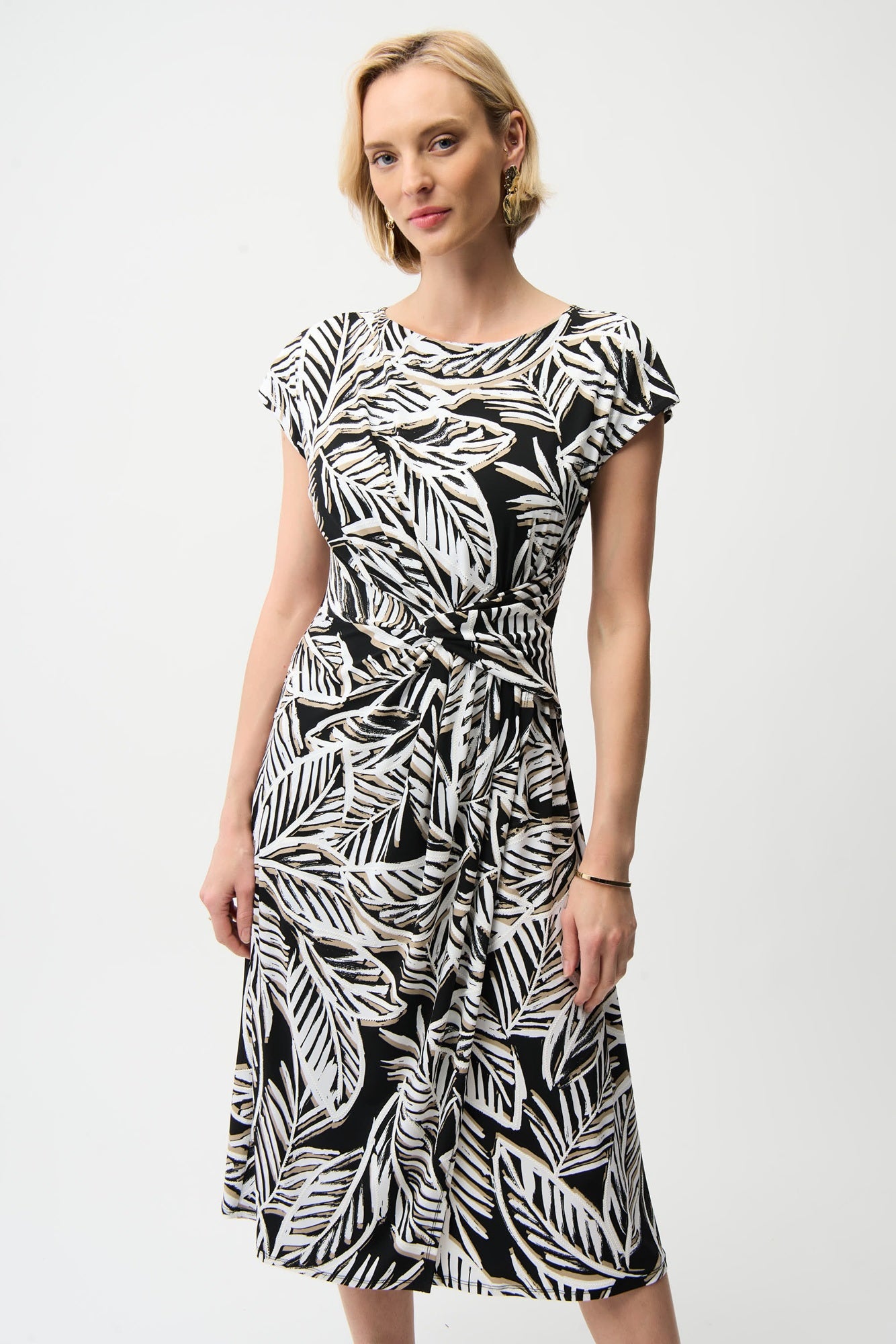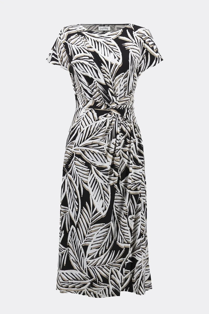 Style Details: Step into effortless elegance with this Joseph Ribkoff Leaf Print Dress, a perfect blend of comfort and feminine charm! Its delicate leaf pattern and flattering round-neck design exude timeless grace, while short straight sleeves and a belted, knotted waist enhance the silhouette. Versatile and chic, this dress transitions seamlessly from casual summer outings to special occasions, combining classic appeal with modern sophistication.