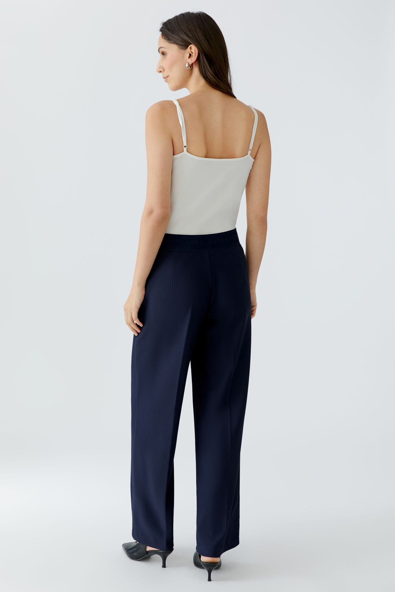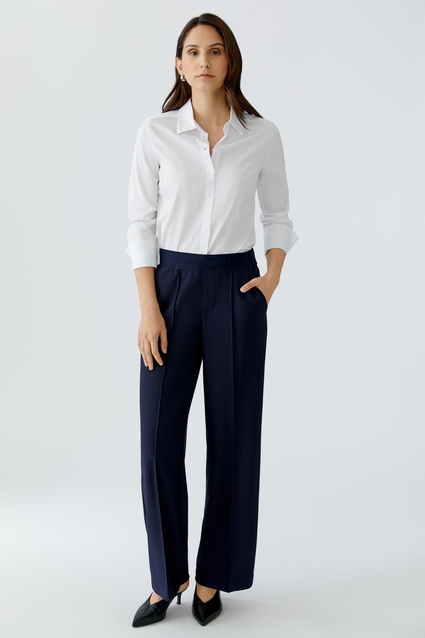 Style Details: The Lacy Navy Trousers combine ease and polish for everyday wear! Made from an easy-care polyester and spandex blend in a refined diagonal ottoman weave, they offer a straight fit with a regular length, mid-rise silhouette, designed to slip on effortlessly, an elastic waistband with a rubberised Oui logo print and practical side pockets. Also available in Off-white.
