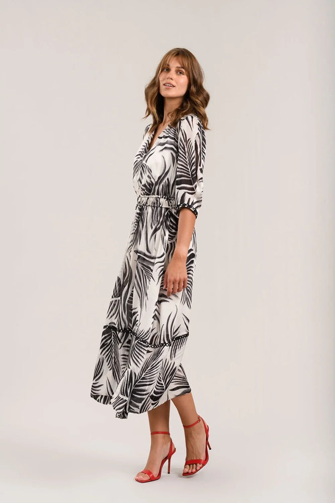 Style Details: Fresh, modern, and effortlessly stylish, the July Dress brings playful polish to day-to-occasion dressing! Featuring a monochrome leaf print makes an instant statement, flattering V-neckline, soft short sleeves, under slip, gently elasticated waist create an easy, feel-good silhouette that moves beautifully, flowing midi skirt and delicate trim add a feminine touch, balancing bold print with graceful detail. Comfortable yet eye-catching, this is the kind of dress that feels just as perfect for daytime plans as it does for spontaneous evening outings!