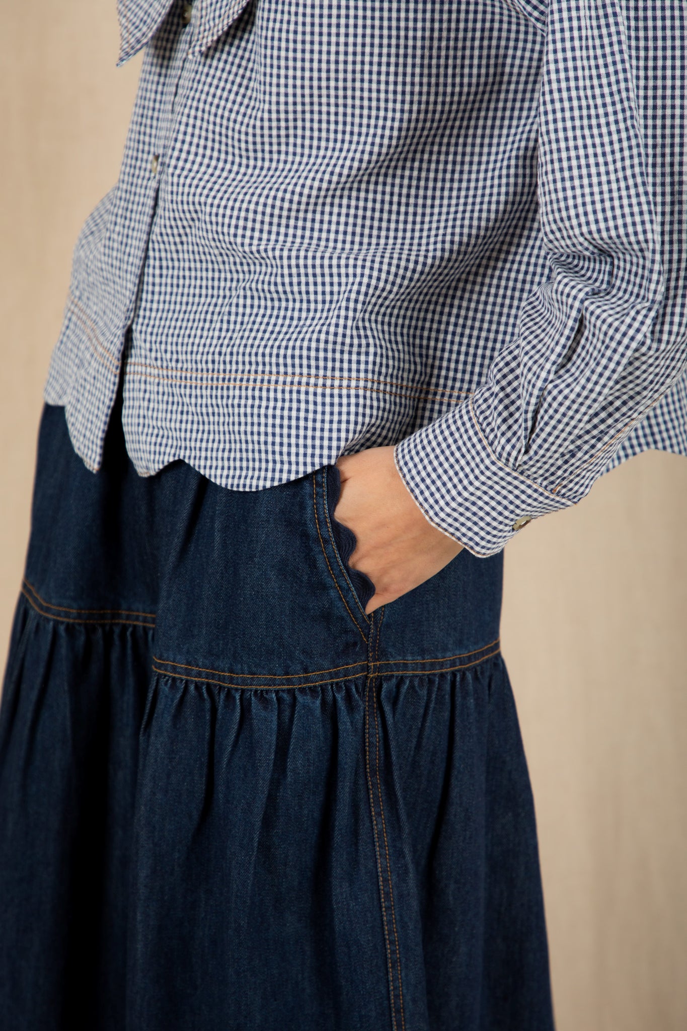 Style Details: The Manderie Skirt features a maxi-length silhouette, crafted from mid-weight cotton denim in a rich dark wash, elevated with contrast tan topstitching, elasticated waistband, flattering yoke detail, it falls into a softly gathered skirt for effortless movement, side seam pockets add practicality, while a deep hem panel with delicate ric-rac insert detailing brings a subtle feminine finish. Pair with our Loane Shirt and sandals for a chic summer look!