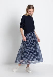 Style Details: This navy knit pullover by More & More offers a perfect combination of feminine elegance and relaxed style. Featuring a flattering boat neckline, 3/4 length wide batwing sleeves, designed with a loose, oversized fit that ensures comfort and ease of movement, ribbed cuffs at the ends, made from skin-friendly viscose, it feels soft and luxurious against the skin. Versatile enough to pair with a flowing skirt for a chic look or with faded jeans or sporty cargo trousers for a more casual vibe.