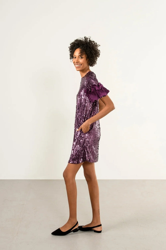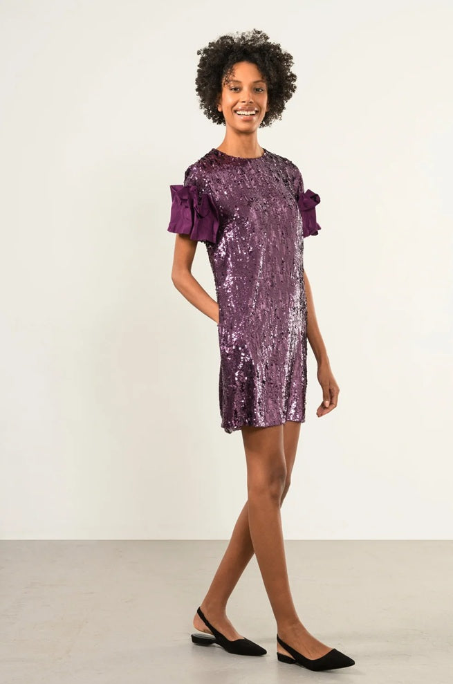 Style Details: The Cecilia Aubergine Dress is a chic fusion of sparkle and understated elegance! Featuring short sleeves with delicate taffeta trim, a classic round neckline, its playful short length is perfectly balanced by thoughtful tailoring, the sequined front catches the light with every movement, while the solid-coloured back keeps the silhouette sleek and sophisticated, practical side pockets and a concealed back zip add functionality without compromising style, and a fully lined interior ensures comfort and polish. Effortlessly glamorous, the Cecilia Dress is perfect for making a statement at any event!