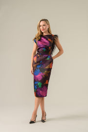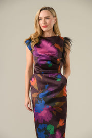 Style Details: The Celine dress is a captivating celebration of elegance! Crafted from lustrous satin adorned with a striking floral print, it features an artfully draped neckline that flows with grace, soft feather details at the shoulders that add a hint of theatrical charm, the pencil silhouette skims the figure beautifully, while the midi length offers timeless sophistication, side pockets, concealed zip closure at back, slit at center back, lined. Designed for weddings, race days, and unforgettable moments, the Celine is a statement of refined allure!