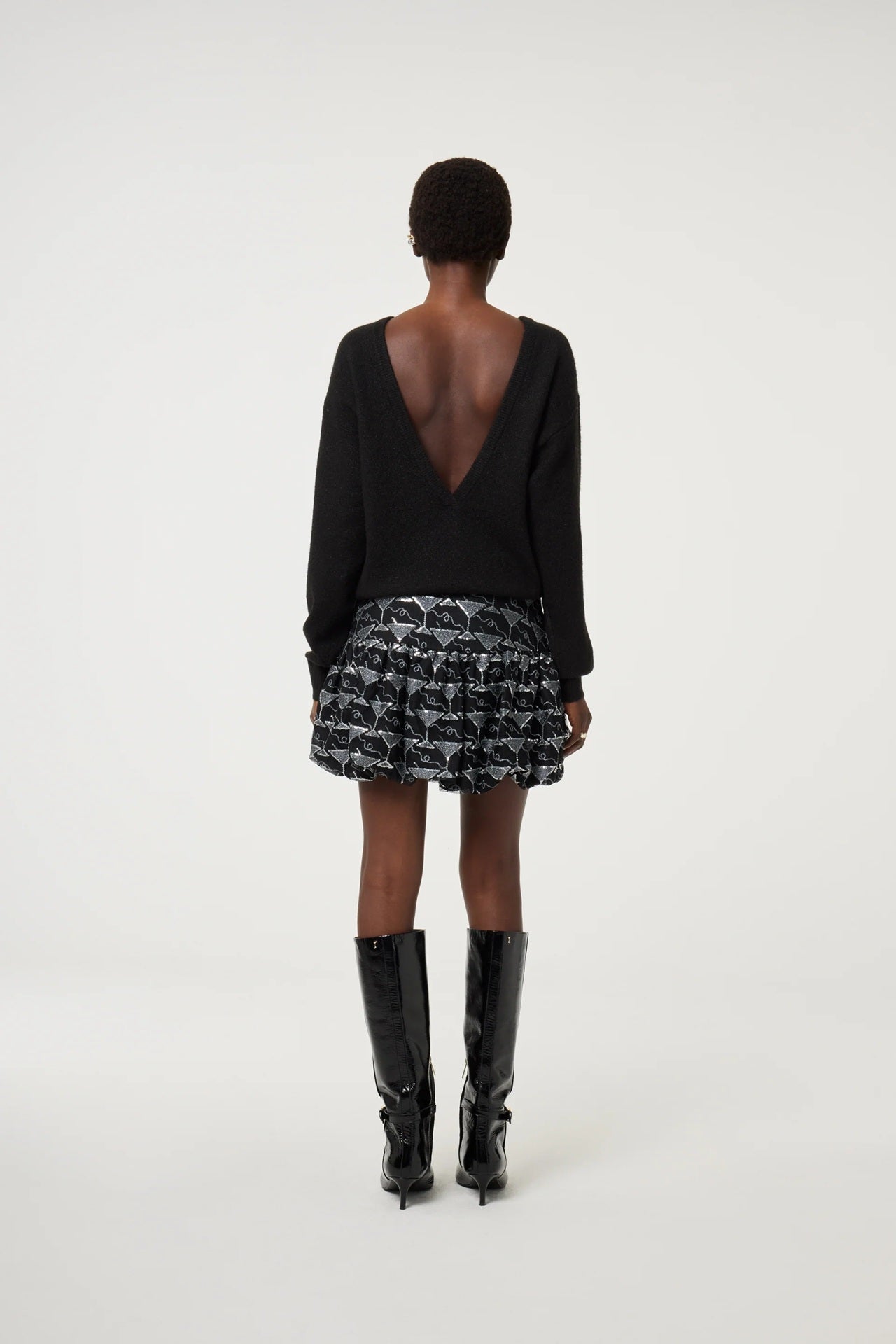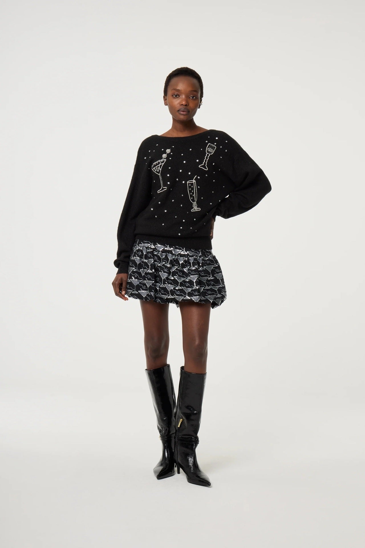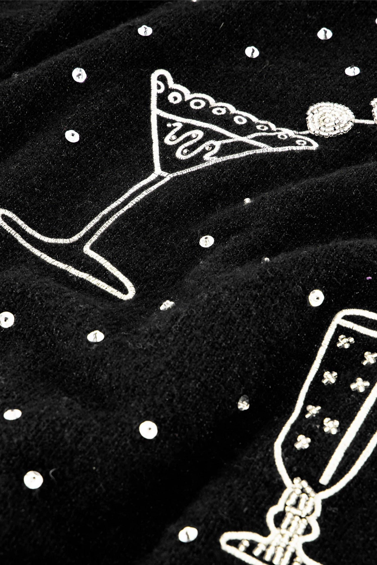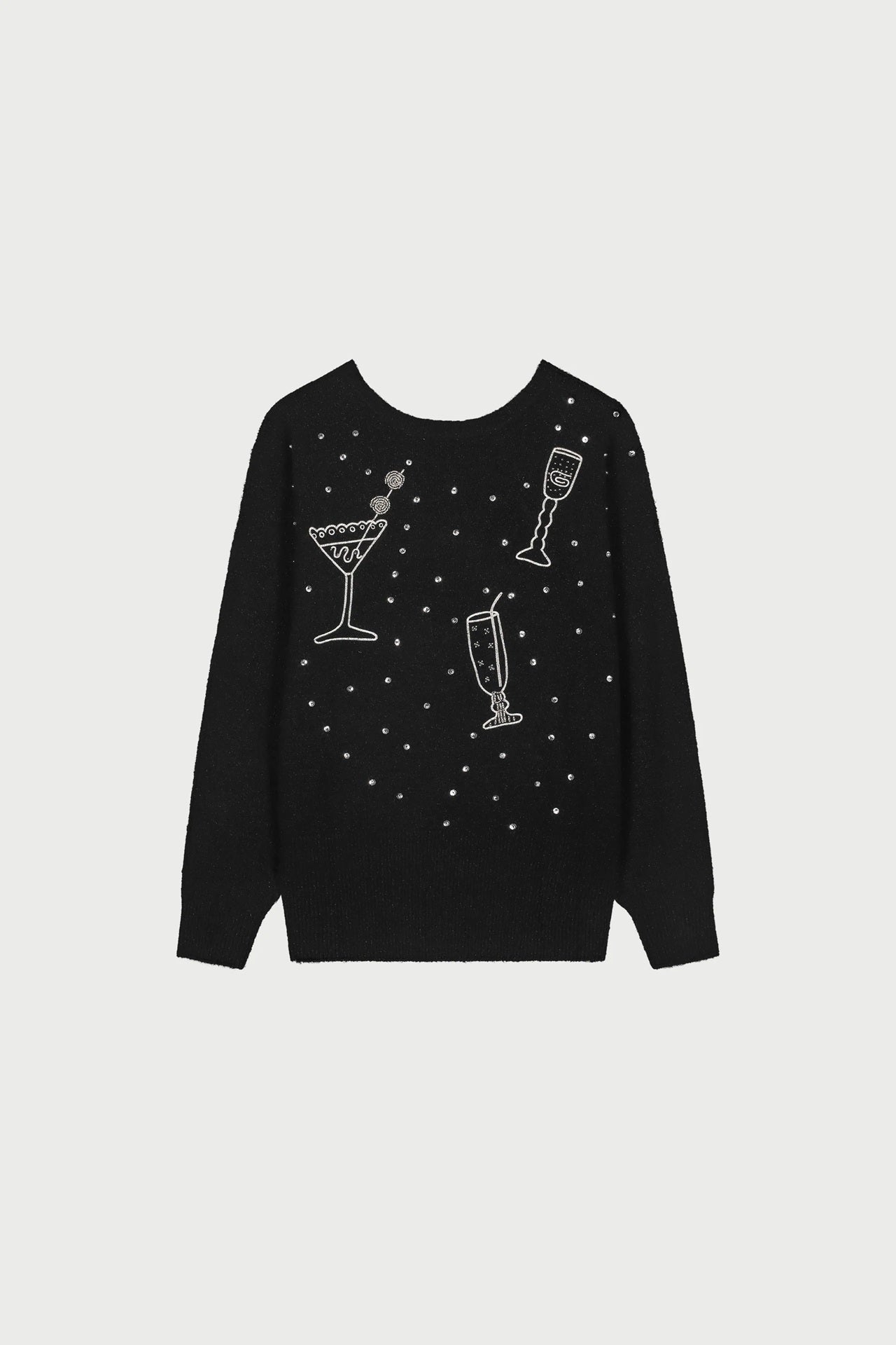 Style Details: Bring a touch of playful charm to your wardrobe with this knit black sweater, featuring whimsical cocktail glass designs and scattered dot details, round neck at front and v-neck at back, long sleeves, cosy, soft, and easy to wear, it adds a fun twist to your everyday style. Perfect for pairing with jeans or a skirt, this sweater blends casual comfort with a festive flair—ideal for effortless, feel-good dressing!