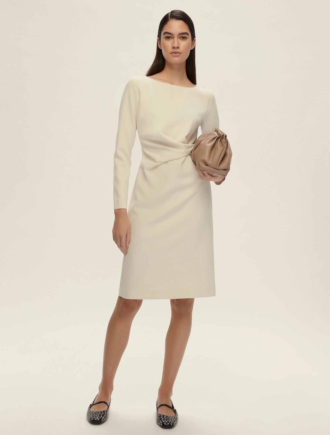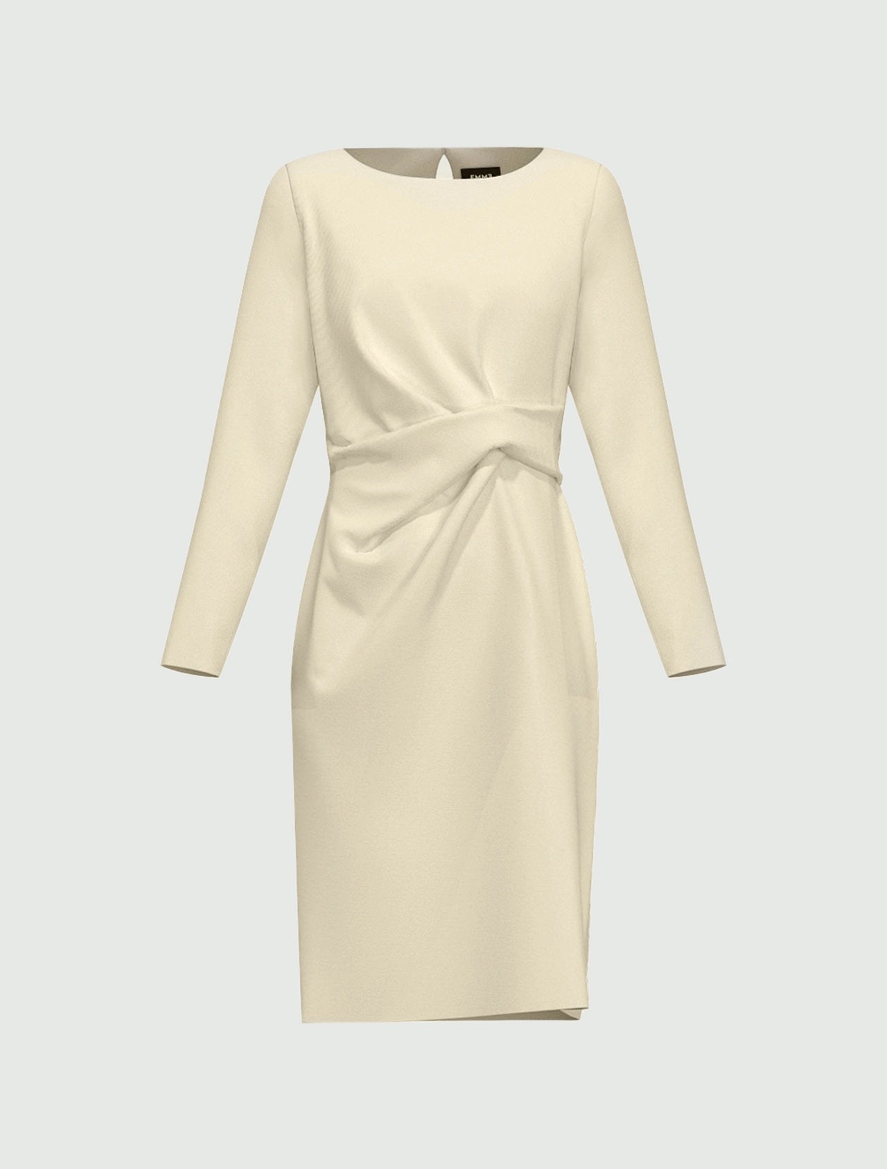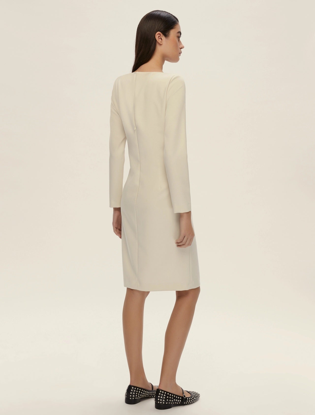 Style Details: Make a statement with understated elegance in the Kadiak Wool White Dress, a minimalist design infused with character! Crafted from stretch double-faced fabric, it sculpts the silhouette effortlessly, while the side knot detail adds a refined, graphic accent, the rounded neckline with keyhole, long sleeves, and concealed back zip ensure a sleek, modern Pair it with boots for daytime sophistication or heels for an evening-ready finish. Also available in Black.
