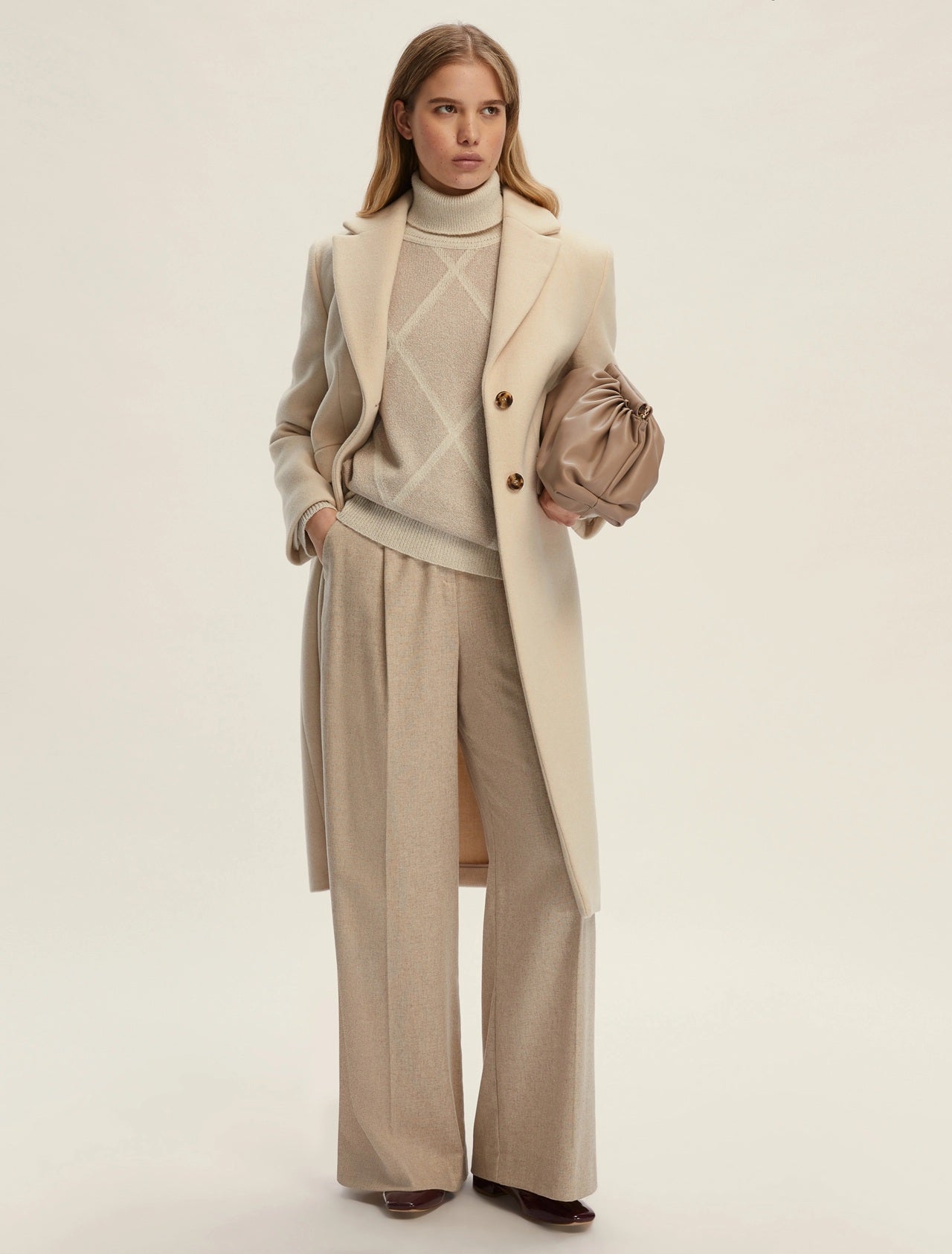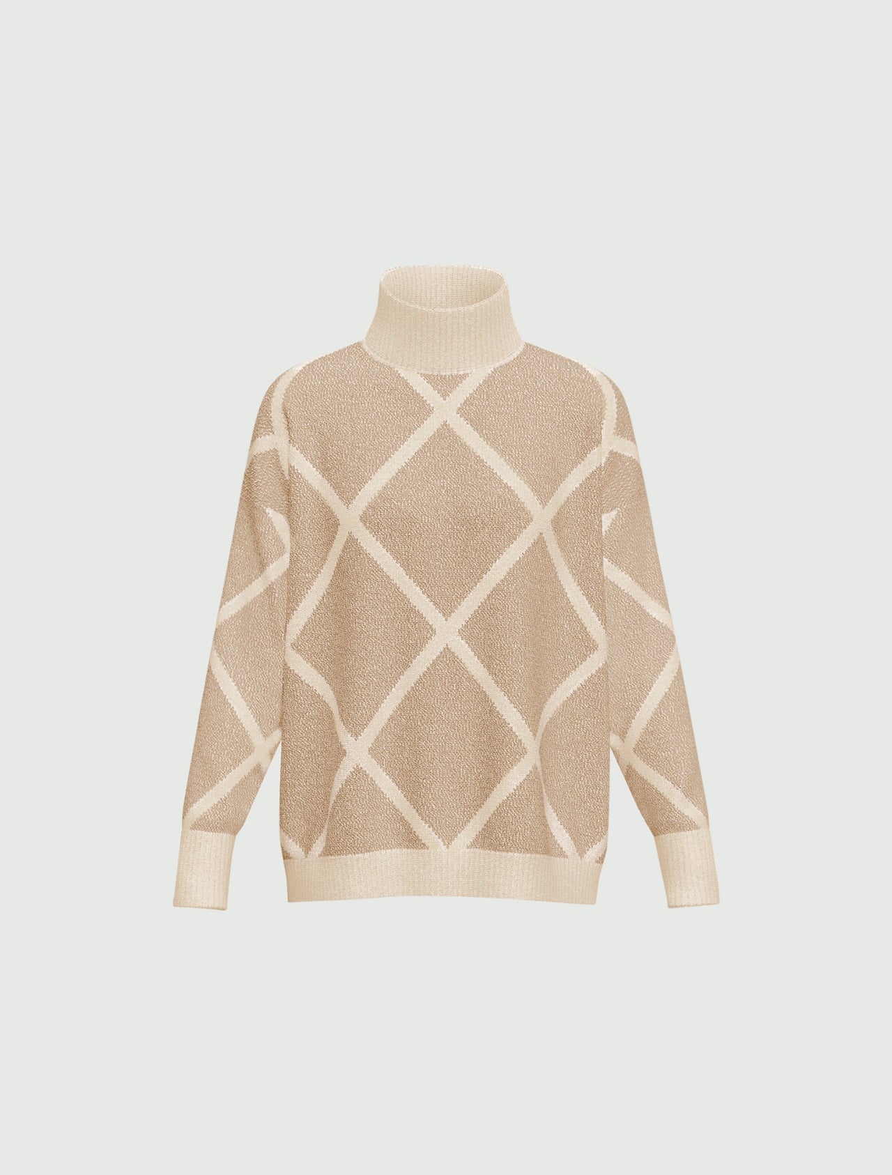 Style Details: Shine with effortless style in the Dorato Knit Sweater in Ecru, a graphic, enveloping piece designed to elevate your wardrobe with subtle sparkle! Crafted from lurex-embellished mouliné yarn, its two-tone diamond pattern adds a luminous twist to everyday looks, the oversized fit, high neck, and dropped shoulders create a contemporary silhouette, while rib-knit hem and cuffs provide a polished finish. Perfectly paired with sleek trousers or flowing skirts, this sweater blends modern elegance with cosy comfort.