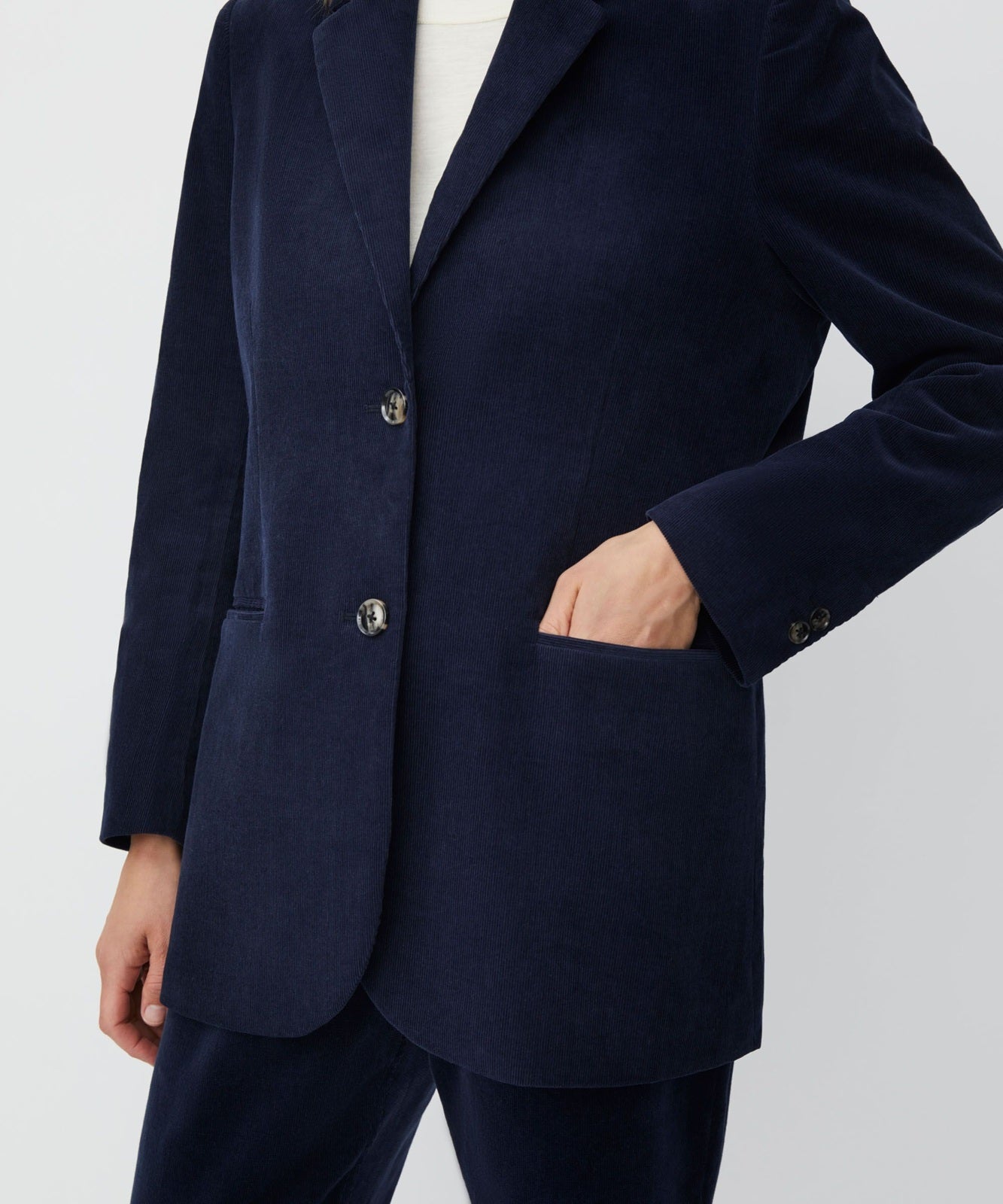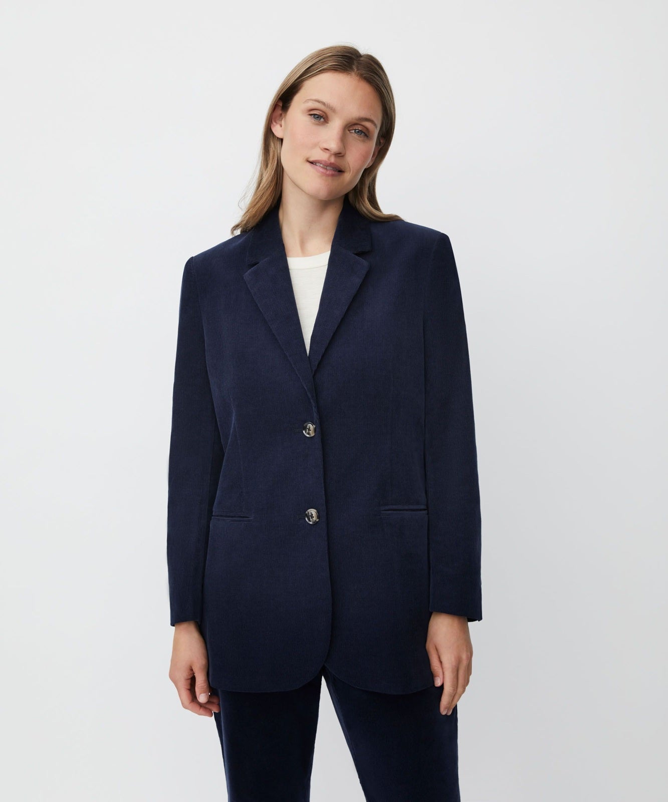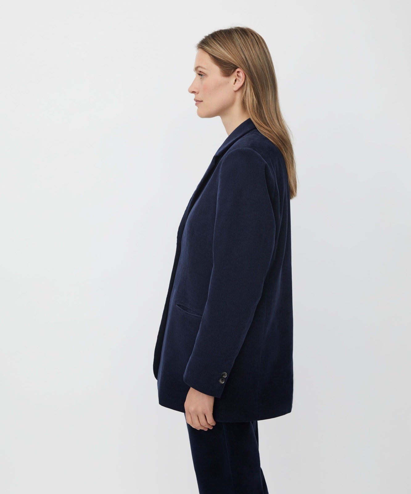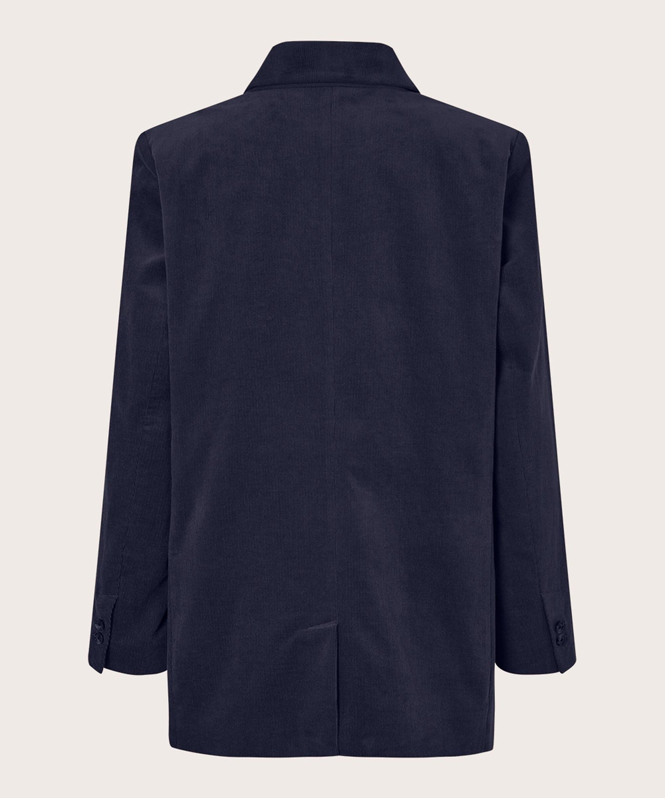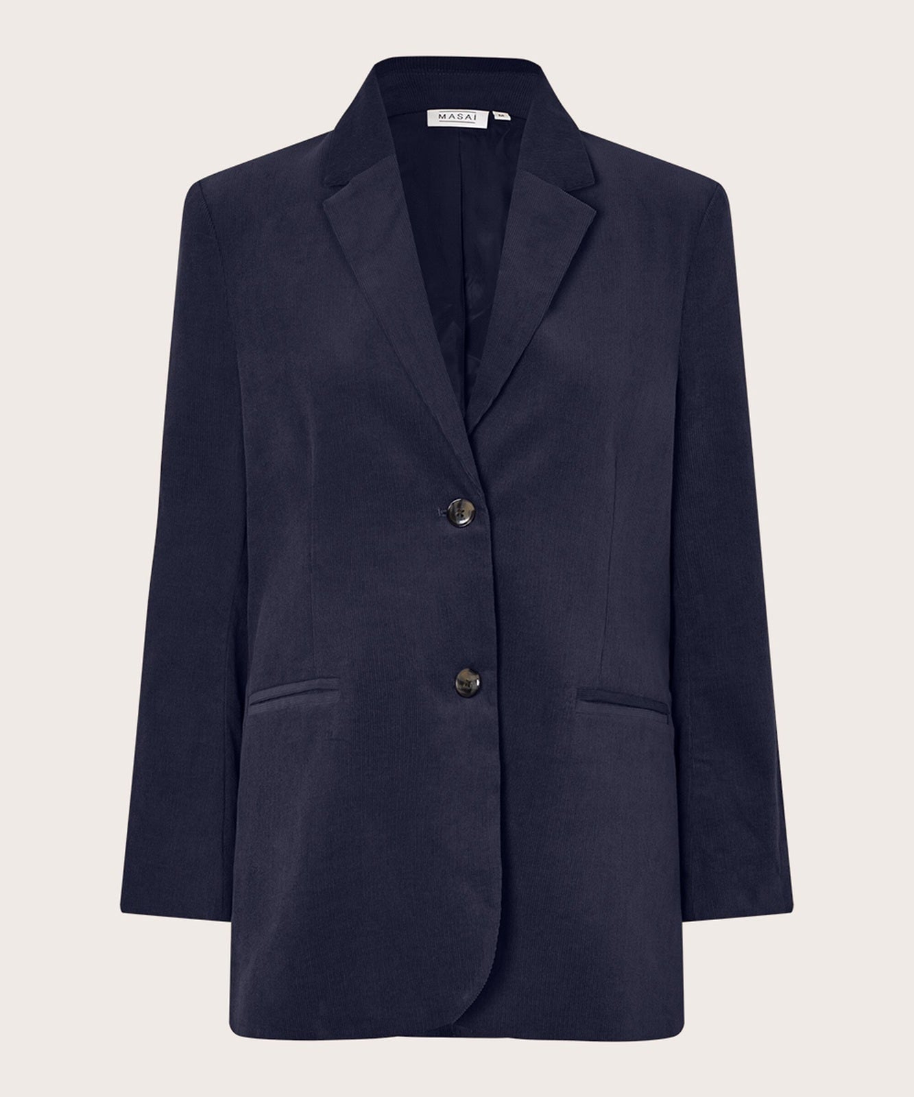 Style Details: Step into modern sophistication with the Jaxi Navy Jacket by Masai. Crafted for a perfect balance of elegance and ease, it features tailored shoulders, narrow sleeves, a relaxed fit that flatters every silhouette, classic lapels, welted pockets, and two front buttons add timeless detailing, while the soft corduroy fabric gives a contemporary, textured appeal. Wear it with tailored trousers for a sleek, modern suit, or mix it with jeans and a tee for a casual, edgy look.