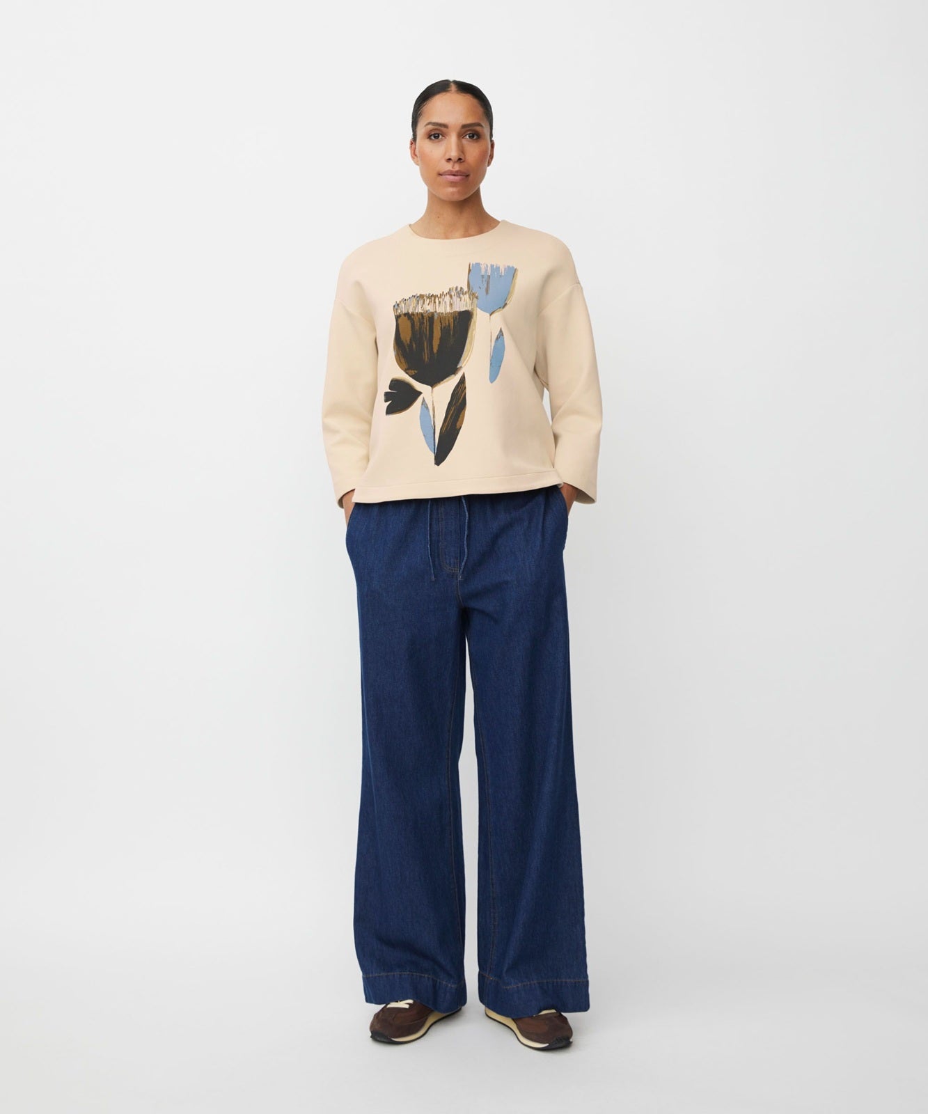 Style Details: Make a statement with understated elegance in the Desvon Jersey Top, where eye-catching design meets effortless comfort! The hand-painted floral print brings a unique, lively touch to your wardrobe, while the soft, scuba-like fabric offers a structured yet gentle feel against the skin. Featuring a classic straight cut, round neck, subtly rounded hemline, and relaxed silhouette that moves with you. Versatile and stylish, the Desvon Top pairs seamlessly with everything from casual jeans to tailored trousers, making it a modern essential for any occasion!