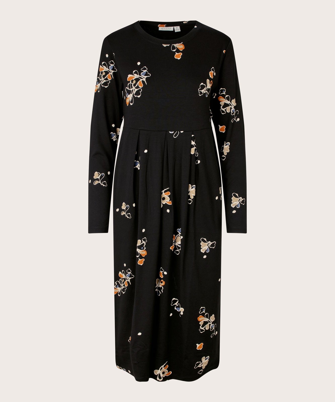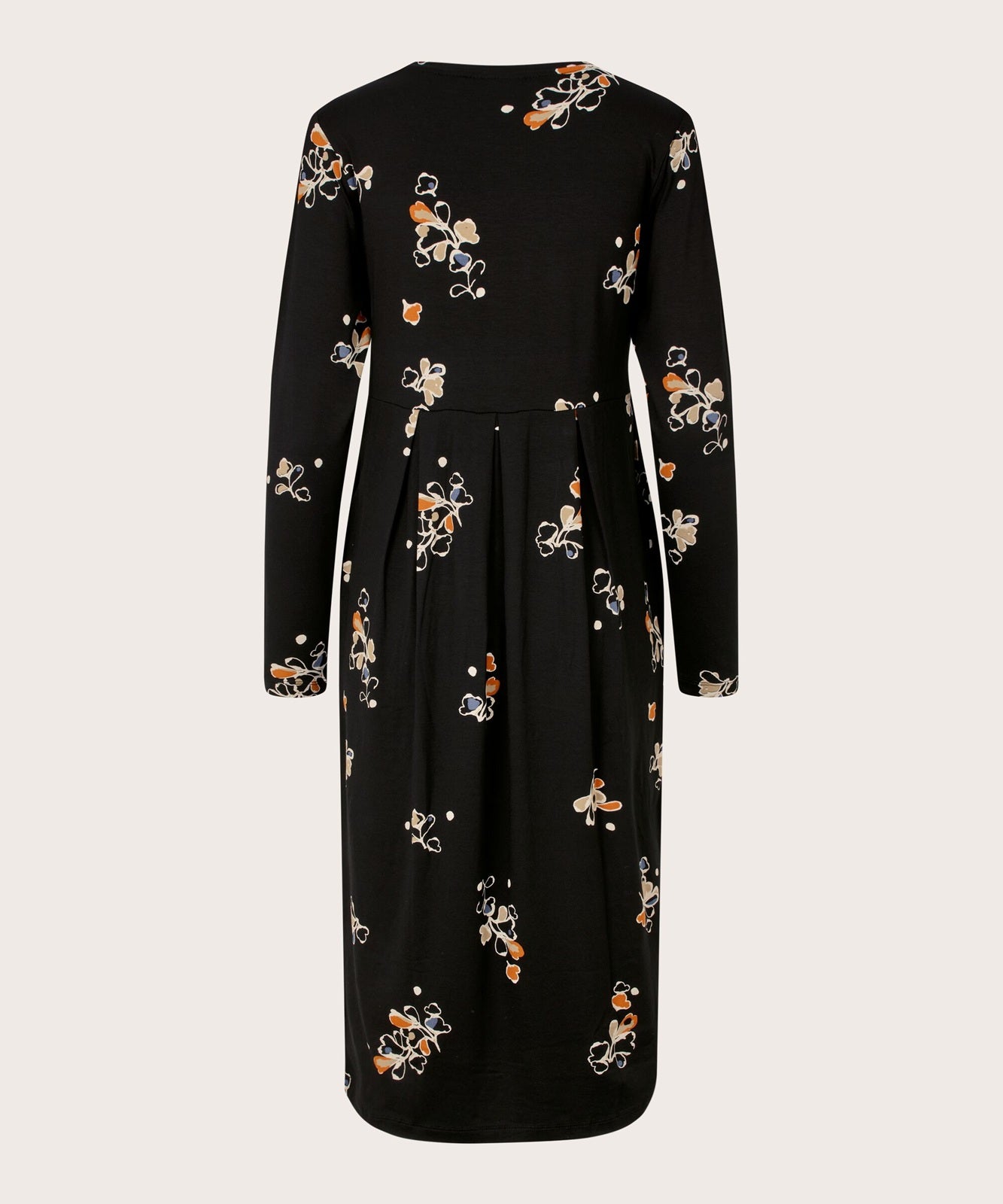 Style Details: Embrace effortless elegance with the Namo Jersey Dress this Autumn/Winter! The combination of its flowing tulip silhouette and rich floral pattern brings a touch of sophistication to any occasion, the soft jersey drapes beautifully over the body, ensuring a flattering fit, delicate pleats, practical side pockets and long sleeves—this dress perfectly balances comfort and style, making it a versatile wardrobe favourite season after season!