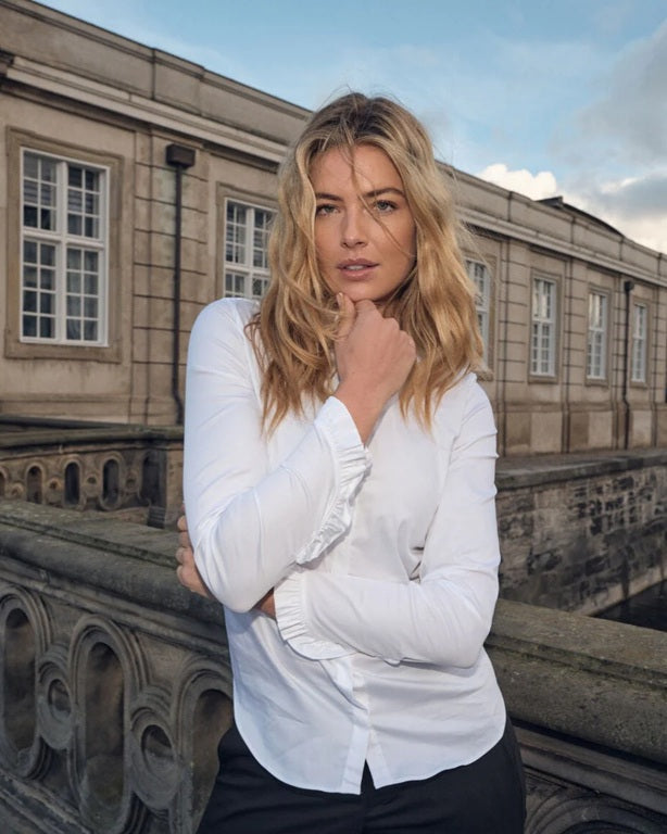 Style Details: Elevate your essentials with the effortlessly chic Mattie Shirt in White—a timeless staple designed to move with you in both comfort and style! Tailored to flatter your silhouette, this wardrobe classic is crafted from a luxuriously soft, stretchy fabric that feels as good as it looks. Featuring long sleeves with delicate ruffled cuffs, classic button-down design and round collar. Whether paired with denim for a casual edge or styled with tailored trousers for refined polish, the Mattie Shirt brings ease and elegance to every outfit!