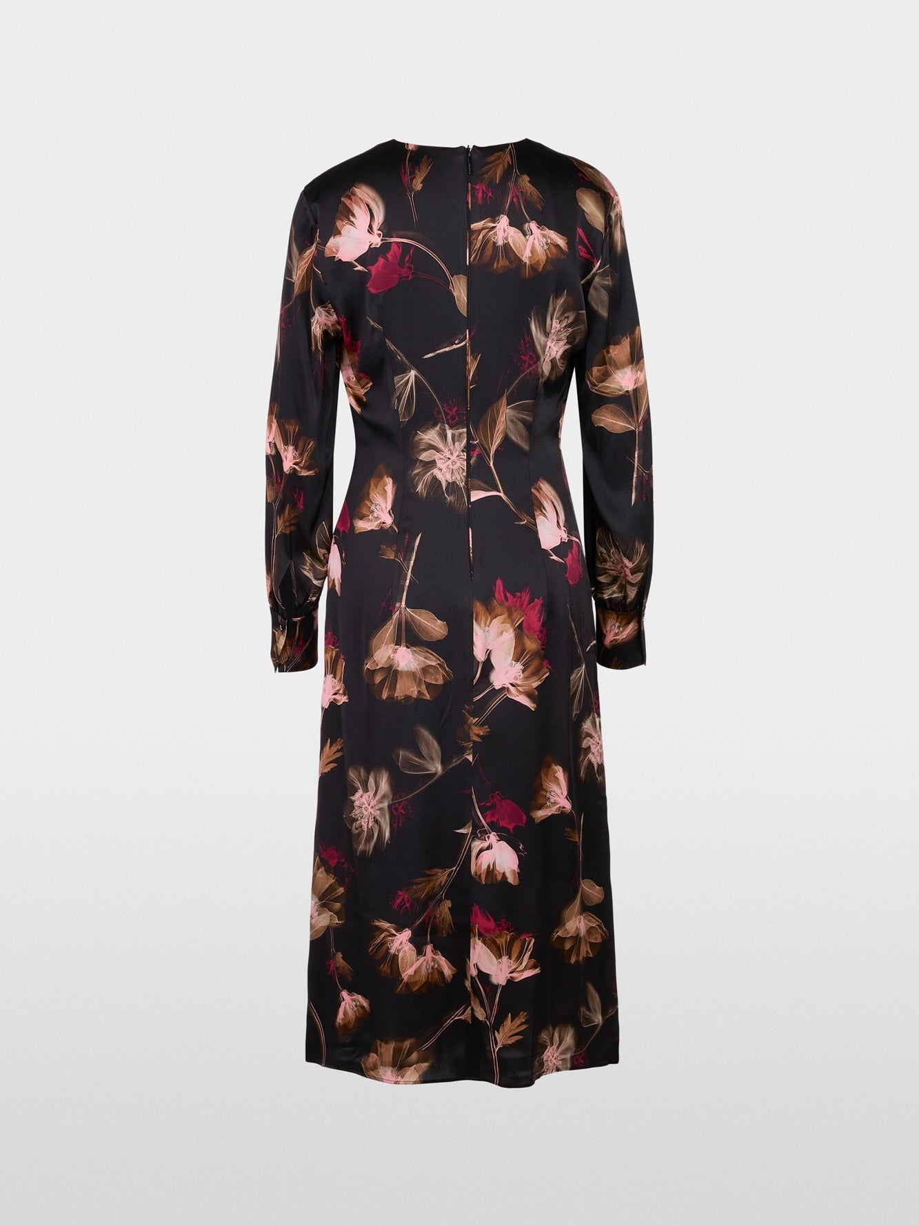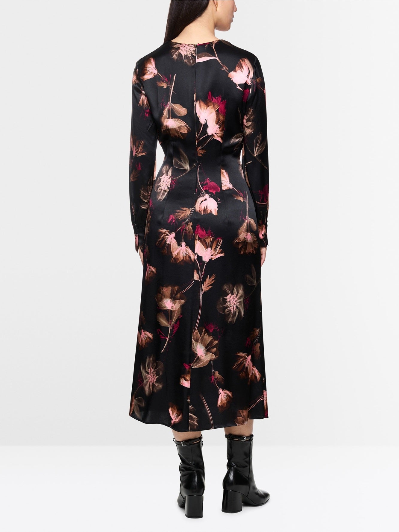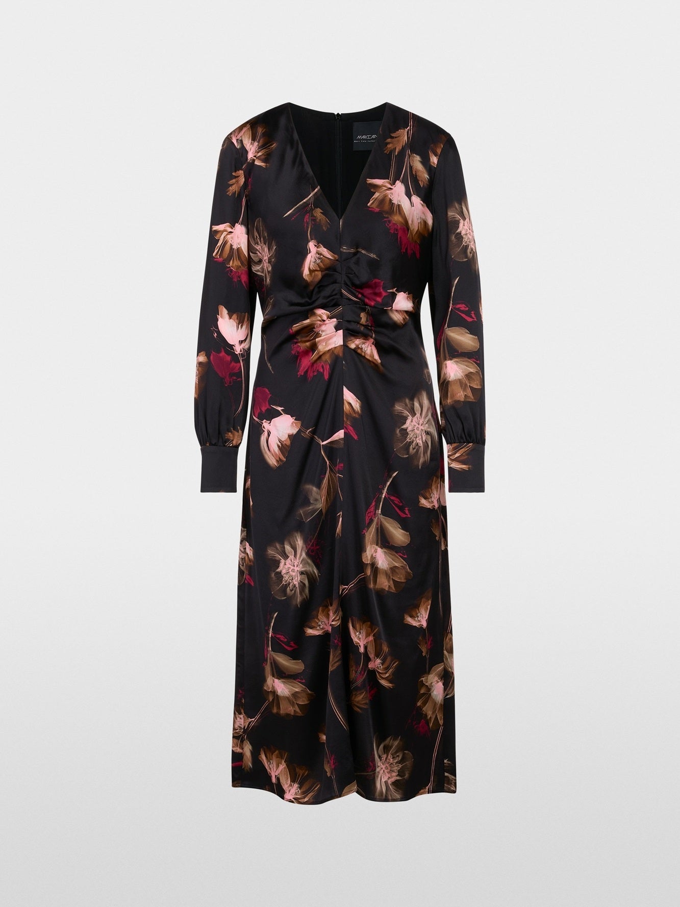 Style Details: Step into effortless elegance with this stunning silk dress in a striking black floral print. Its flowing, loose cut is beautifully enhanced by subtle gathers under the bust and at the waist, creating a feminine silhouette that moves with grace. Crafted with a touch of elastane for ease and comfort, the V-neckline and wide cuff sleeves add a refined, stylish edge. Perfect for special occasions or sophisticated evening events, this dress combines soft luxury with timeless charm!