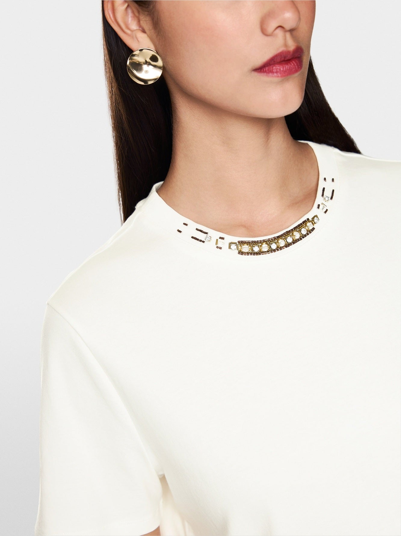 Style Details: Elevate your everyday style with this Off-White beaded T-Shirt, where casual ease meets subtle elegance! Its loose cut ensures effortless comfort, while the delicate rhinestone and pearl detailing along the round neckline adds a refined, sparkling touch, short sleeves and crafted from soft cotton. This tee combines luxurious wearability with standout style, making it the perfect choice for both relaxed days and special occasions.