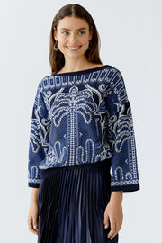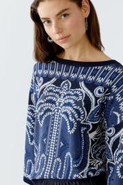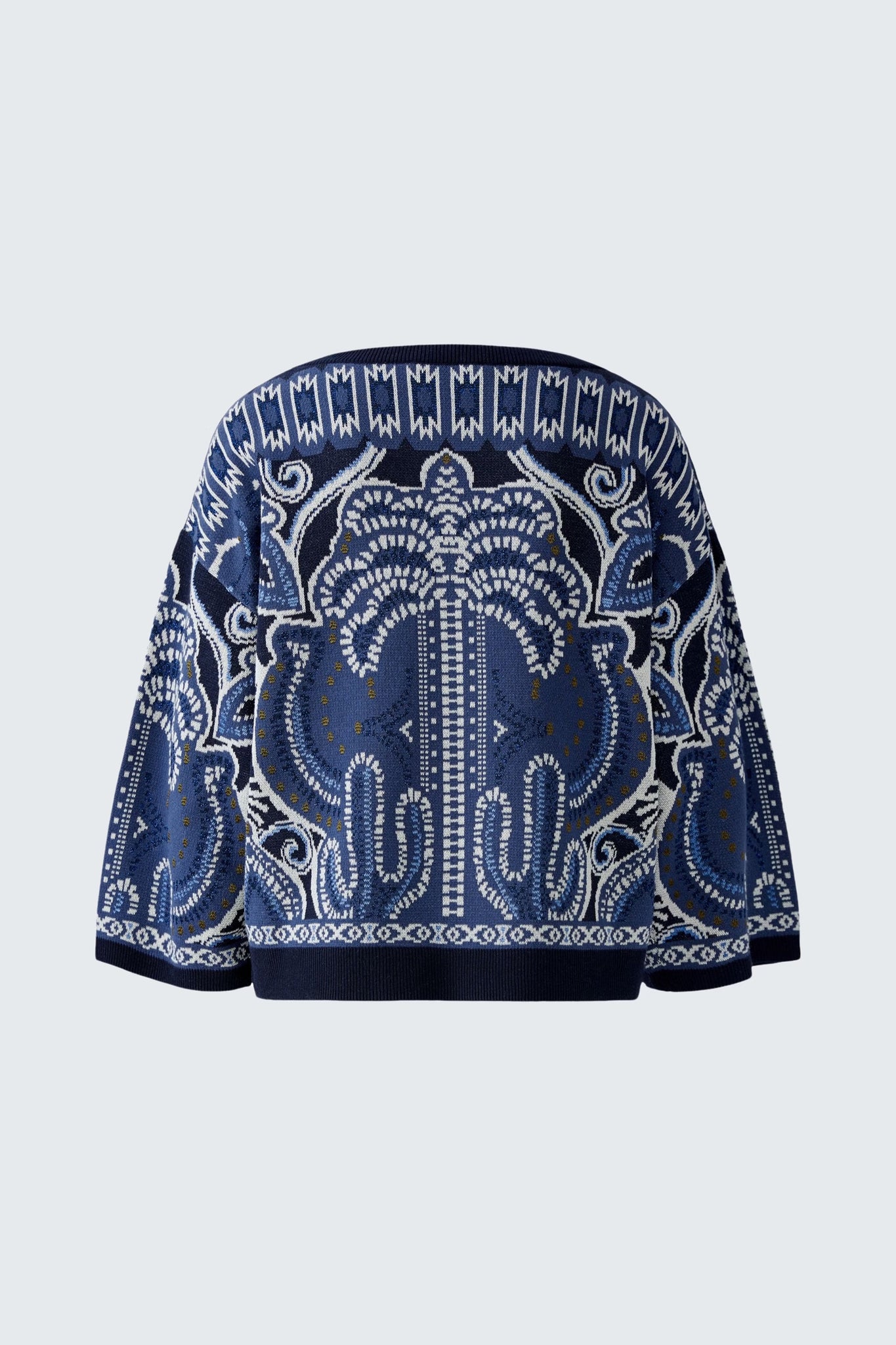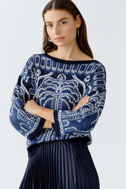 Style Details: A bold statement in contemporary knitwear, this jacquard sweater effortlessly blends artistry with comfort. Crafted from a soft cotton-viscose blend enriched with subtle shiny yarn, it showcases an eye-catching interplay of blue tones with khaki accents for a sophisticated, modern palette. The casual fit and regular length offer ease and versatility, while the elegant boat neckline with a refined placket adds a distinctive touch. Featuring long 3/4 sleeves and contrasting navy knitted cuffs, this piece brings texture, depth, and polish to your everyday look.