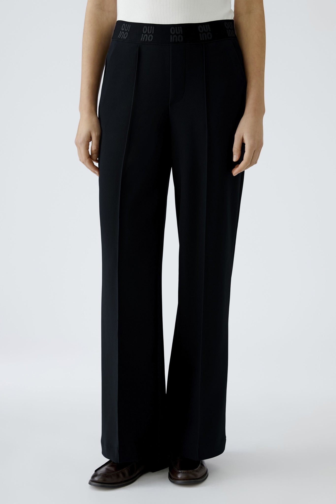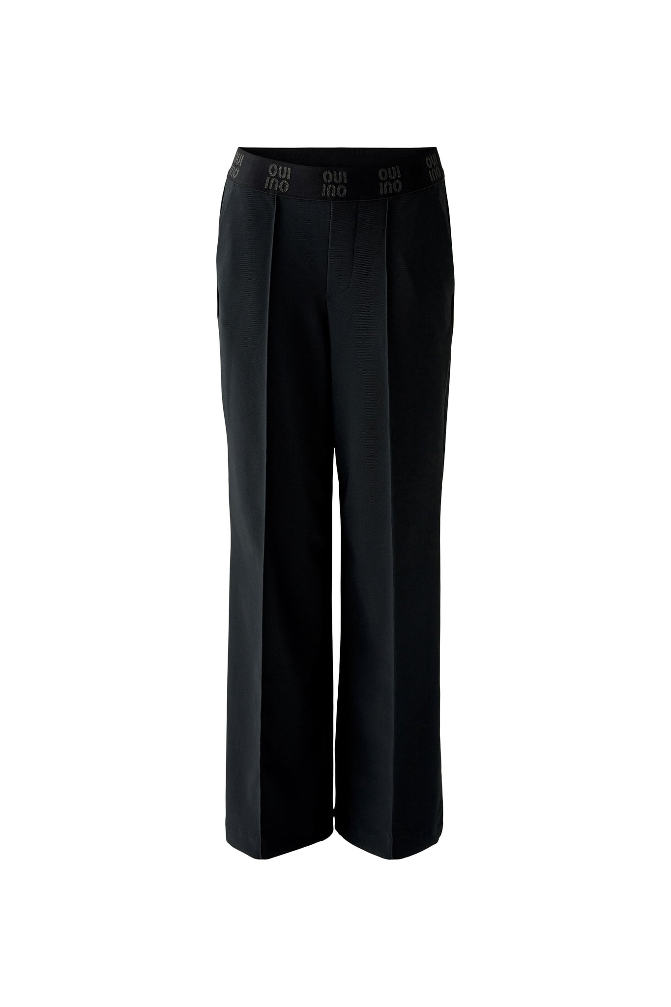 Style Details: Effortlessly combining modern sophistication with everyday ease, these black trousers in a dressed-up, technical stretch fabric are a wardrobe essential for the style-conscious. Crafted from an easy-care polyester and spandex blend in a subtle diagonal ottoman weave, straight fit, mid-rise design, elastic waistband with rubberized Oui logo ensures a smooth, slip-on, side pockets and a permanent front crease highlighted by quilted piping add tailored elegance, making these trousers the perfect choice for a sleek office look, effortless meetings, or chic everyday wear.