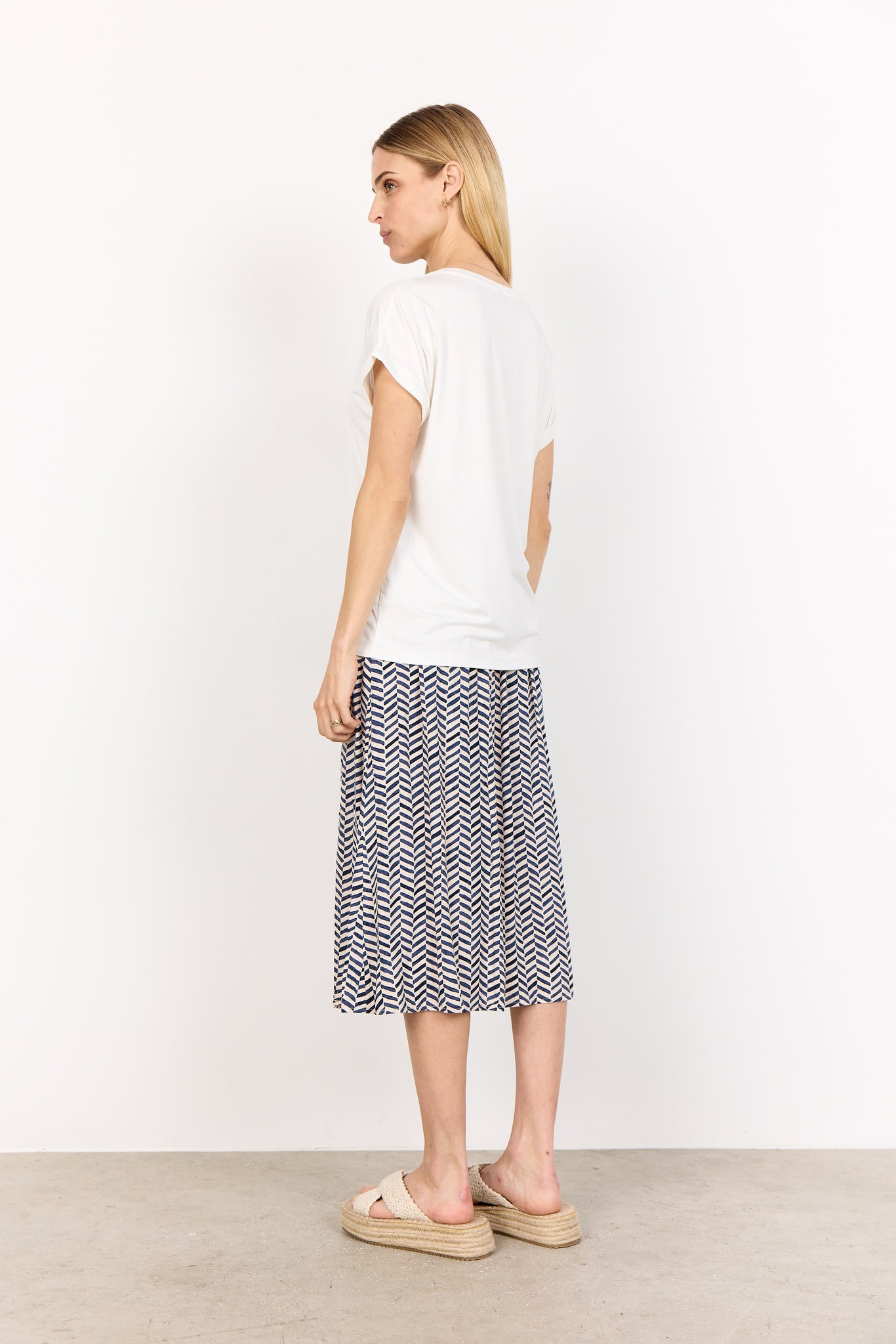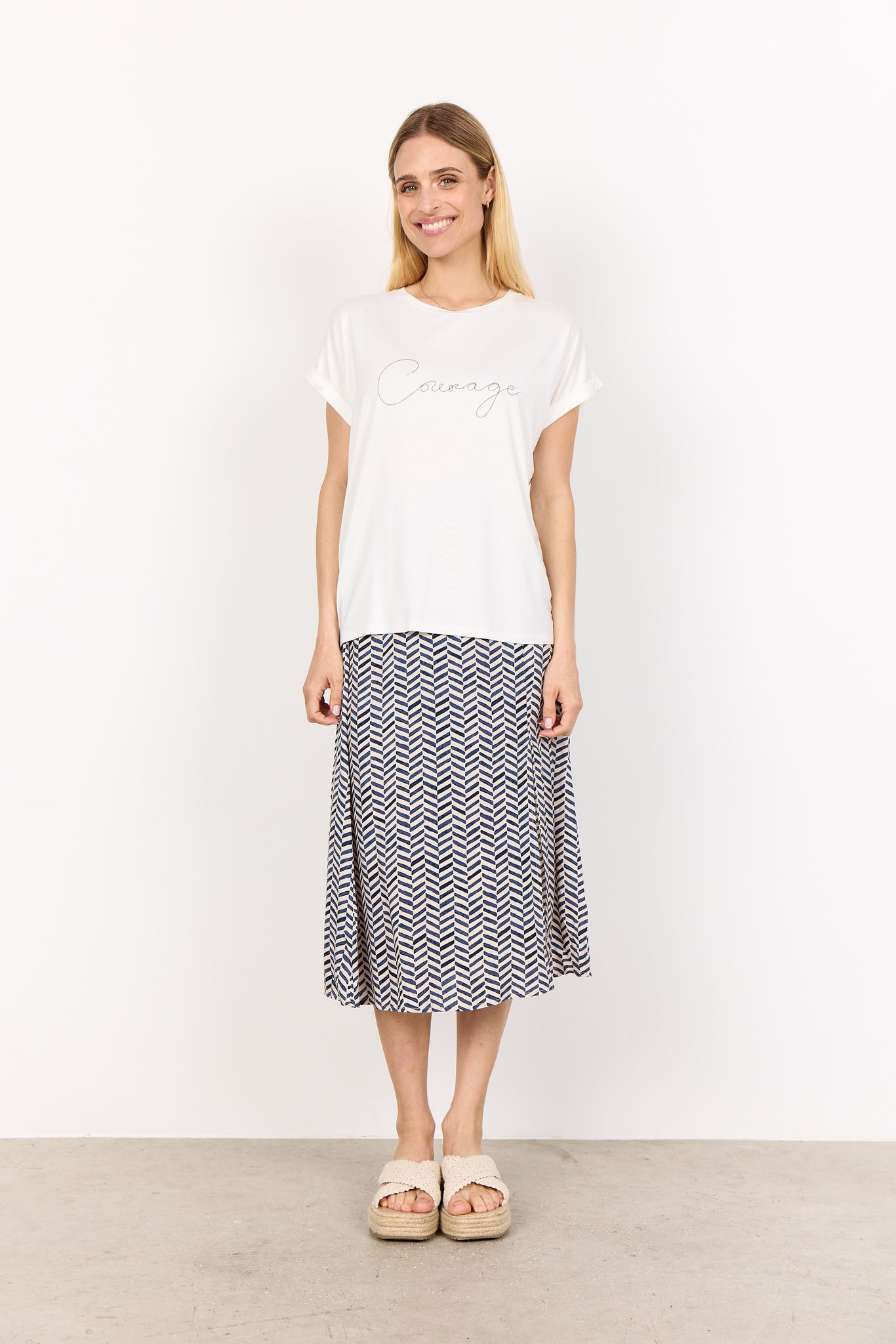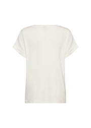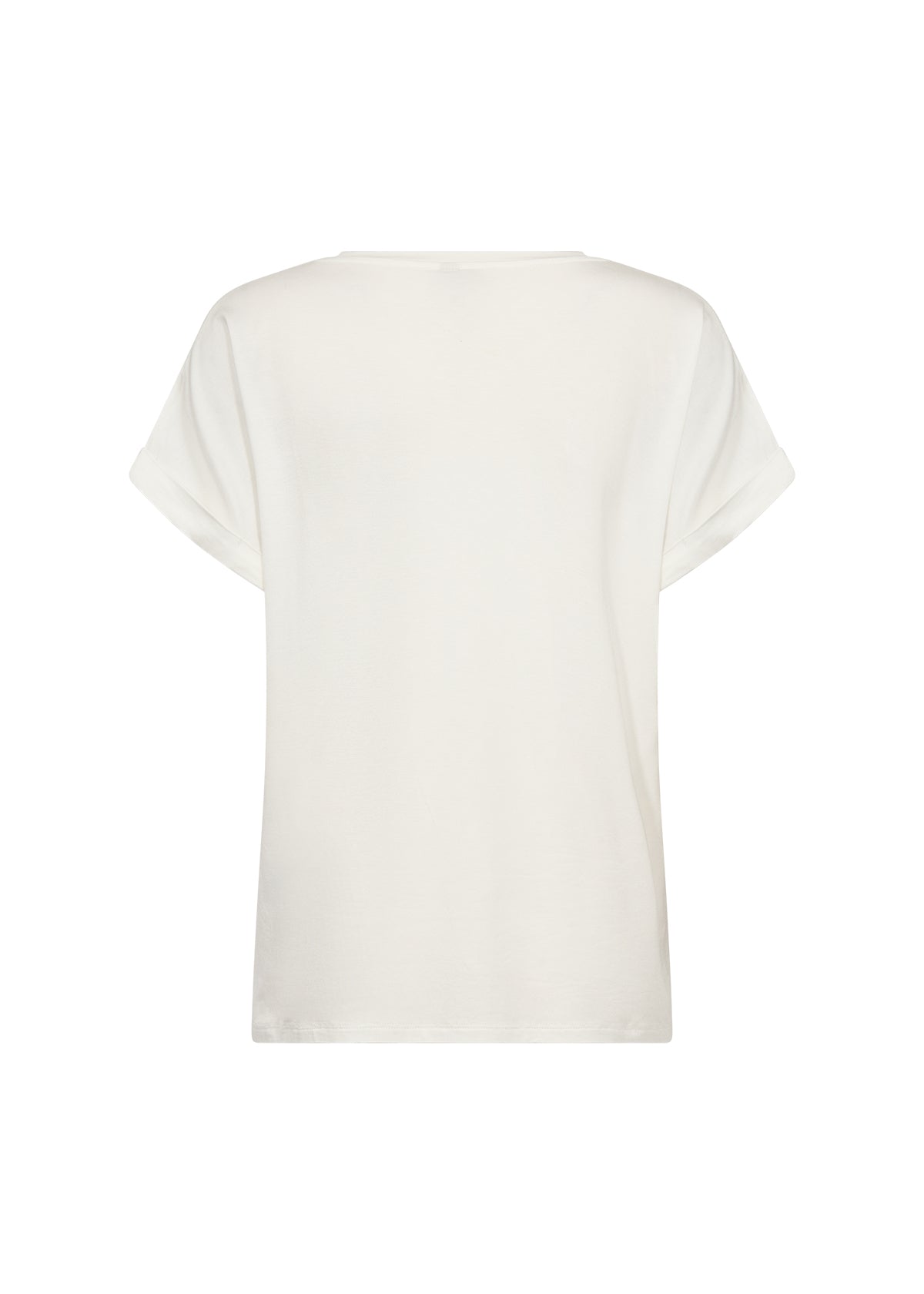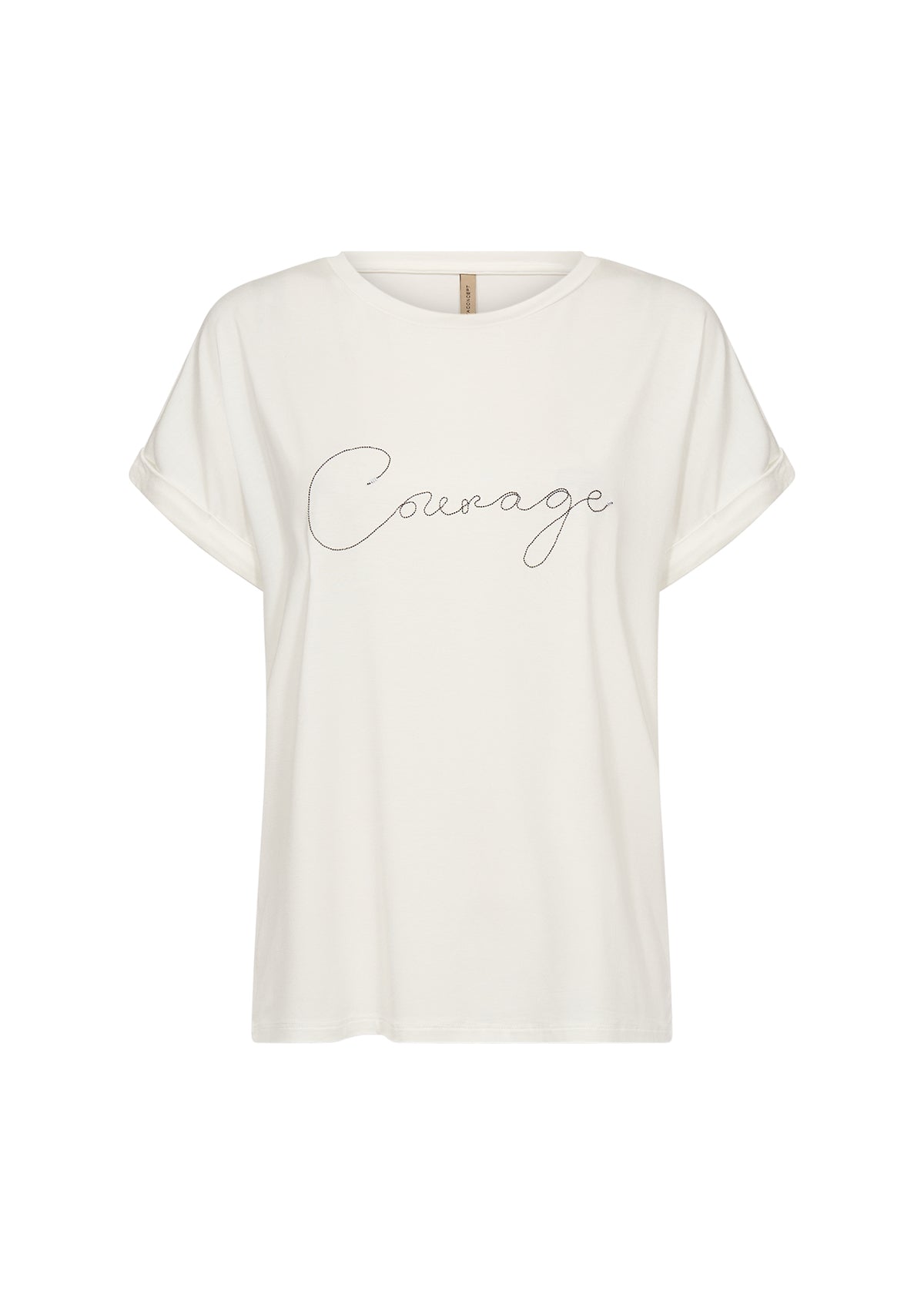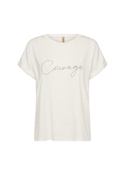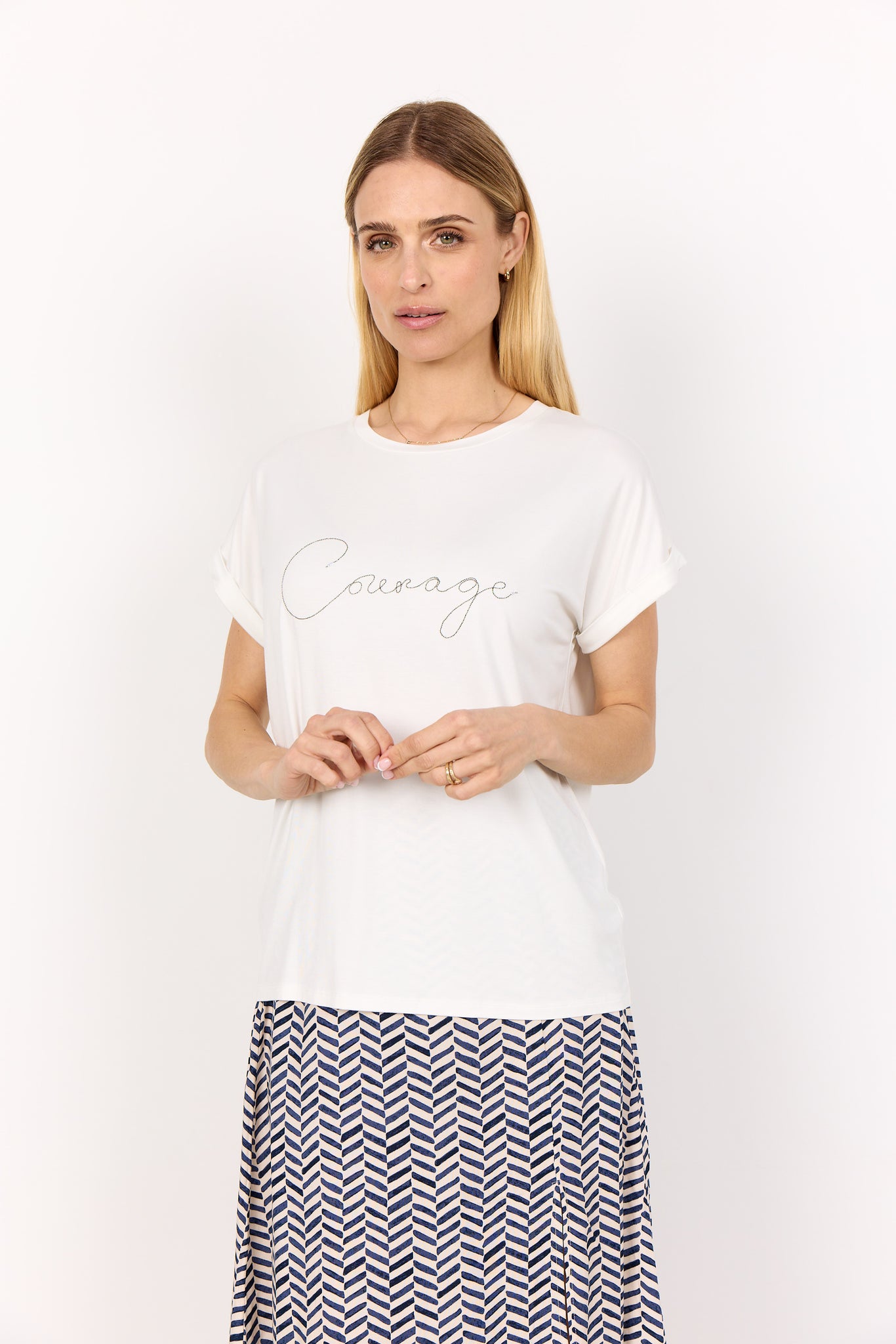 Style Details: The Marica 336 T-shirt is a refined wardrobe staple, crafted from a soft blend of Lyocell and Elastane for a fluid, flattering fit. Featuring a classic round neckline, short sleeves finished with a chic fold-over cuff. This tee is elevated by a delicate “courage” print across the front—subtle yet empowering! Pairs great with denim for effortless ease or tucked into a skirt for polished elegance. Also available in Black.