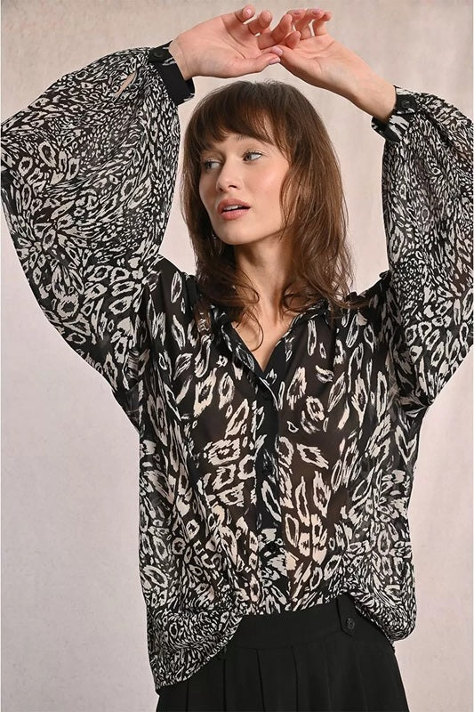Style Details: Make a graceful statement with this flowing blouse by Molly Bracken. Featuring an abstract black print in subtly sheer fabric that exudes modern elegance, airy balloon sleeves, refined with tightened cuffs, and a soft collar that ties into a delicate bow, the straight fit drapes beautifully for a relaxed yet polished silhouette—perfect for pairing with tailored trousers or elevating your favourite denim! It's the kind of blouse that moves with you and speaks volumes without saying a word.
