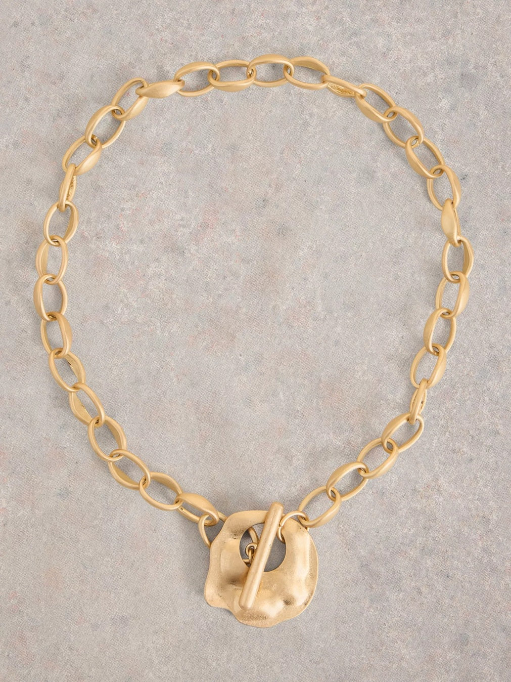 Style Details: Make a bold yet effortless statement with this stunning abstract necklace in gold-tone metallic. Its chunky chain design is anchored by a sculptural charm, reminiscent of a pebble or shell—nature’s treasures reimagined in a radiant golden finish. Striking on its own or layered with delicate chains, this necklace brings a touch of edge and elegance to any outfit, making it the kind of accessory you’ll reach for again and again!