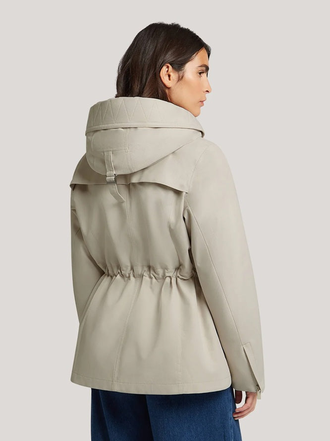 Style Details: Face the elements in style with the Elsa Silver Coat, a modern reinterpretation of the iconic parka designed for both city streets and outdoor adventures! Crafted from waterproof, windproof, and breathable technical twill, with taped seams at critical points, it features an adjustable and detachable hood, a 1-way coated front zipper with windcatcher, slanted patch pockets, and an interior fleece-lined pocket, adjustable waist and hem, rib-knit inner cuffs, and sleeve zippers allow a customisable fit. This stunning coat blends technical performance with contemporary urban chic!