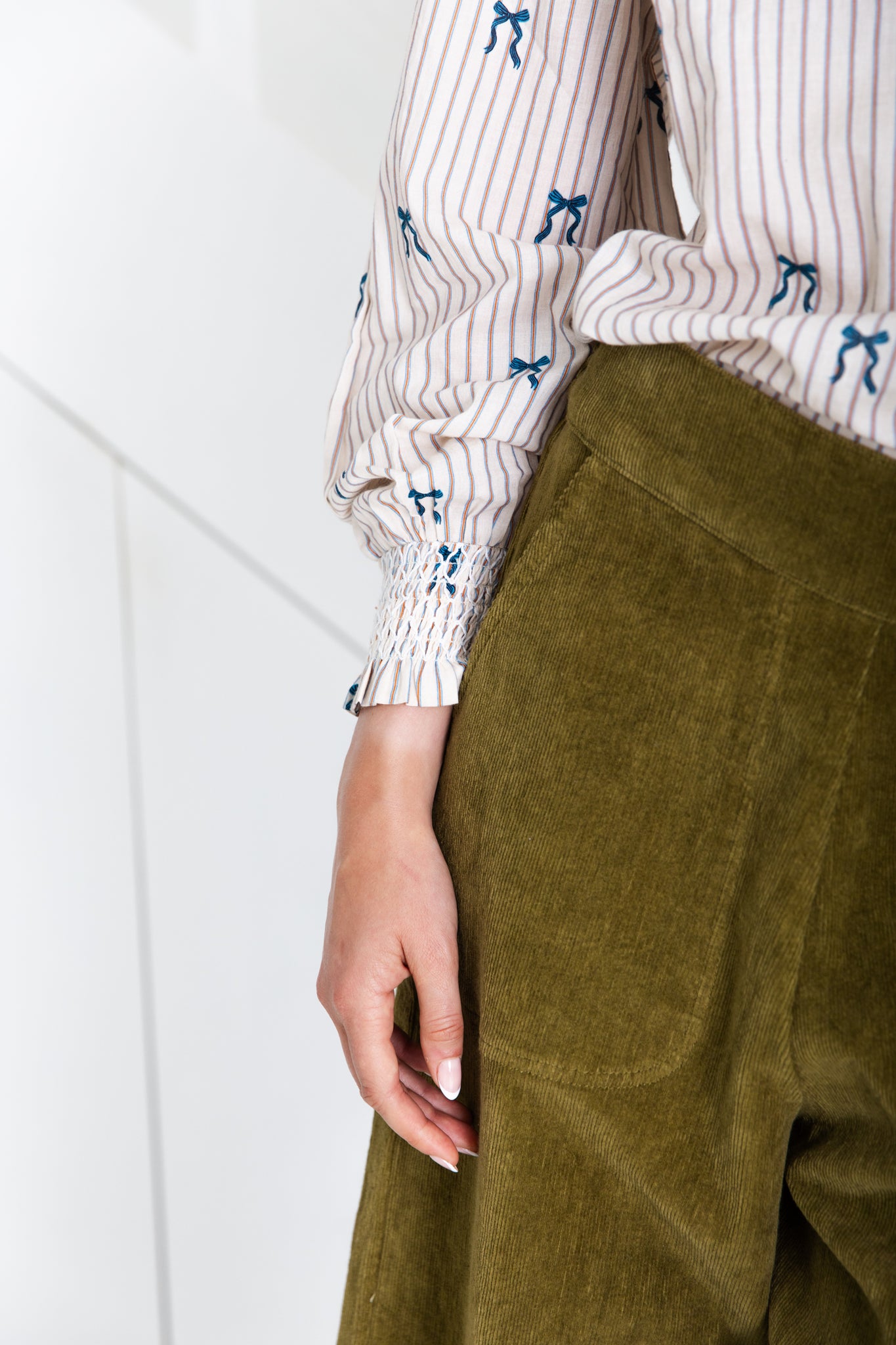 Style Details: Step into refined charm with the Aida Shirt in a serene seamist print, where delicate details meet effortless style! Featuring a high neck with ruffle accents, a short button placket adorned with subtle ruffles, long sleeves with elasticated cuffs and petite ruffle finishes add a touch of whimsy, while the striped pattern accented with blue ribbons brings modern texture to the design, a back pleat enhances movement and structure, making the Aida Shirt a versatile piece that transitions seamlessly from polished workwear to chic weekend layering!