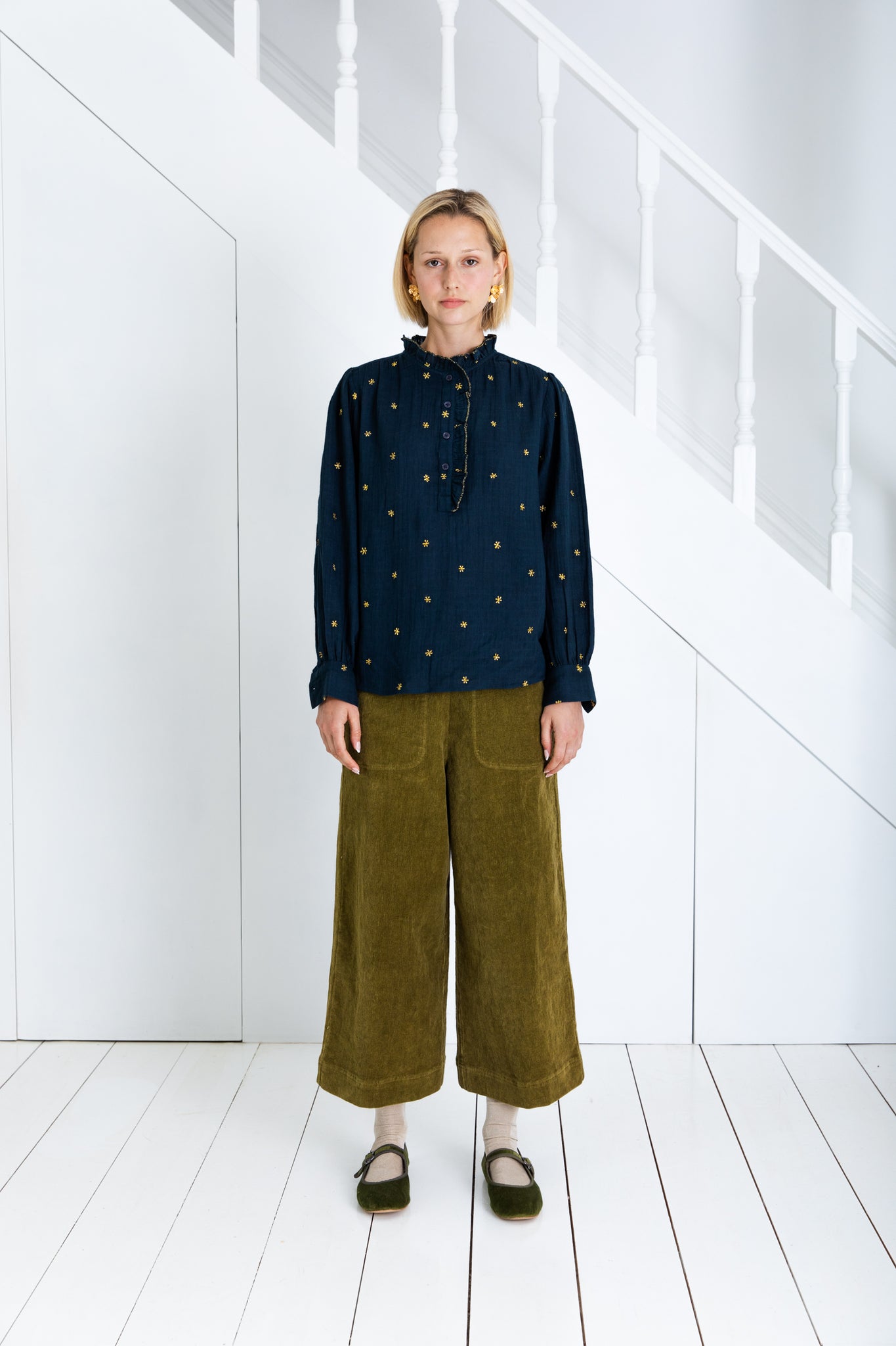Style Details: Step into timeless sophistication with the Anais Shirt in deep midnight blue, where classic tailoring meets delicate detailing! Featuring a high neck, short button placket adorned with subtle ruffles, long sleeves with buttoned cuffs, a back pleat ensure a relaxed yet polished fit, while gold floral embroidery adds a touch of refined sparkle, the rounded hem, slightly longer at the back, creates effortless movement, making the Anais Shirt a perfect choice for both chic office styling and elevated everyday wear!