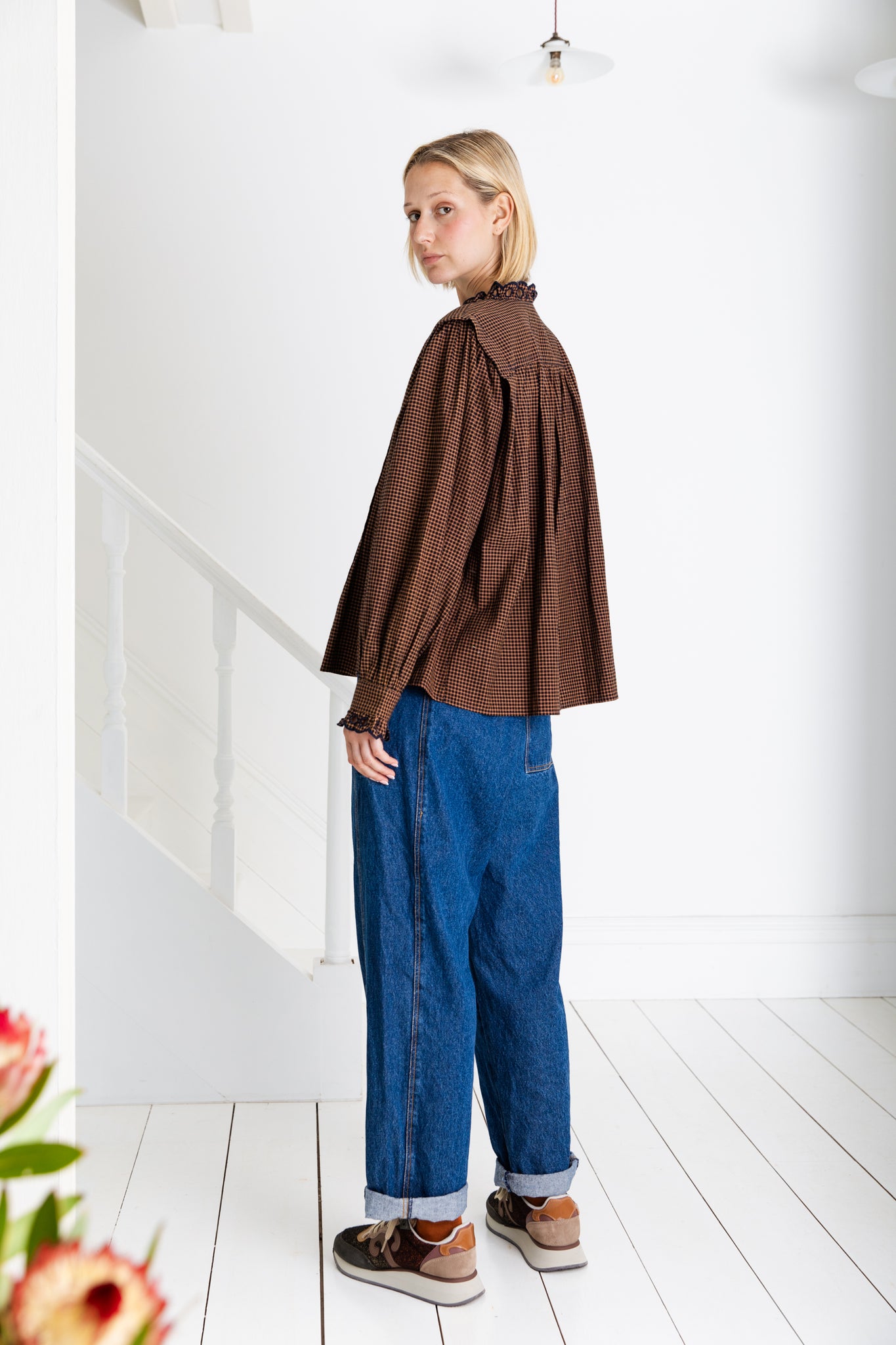 Style Details: Elevate your wardrobe with the Etienne Shirt, a harmonious blend of classic checks and delicate detailing! Crafted in a striking midnight blue and tan check pattern, this oversized shirt features a round neck accented with ruffle and embroidery details, adding a feminine touch to its relaxed silhouette, a button placket and pleat details at the front and back create subtle structure, while long sleeves with 2-button cuffs and matching ruffle and embroidery finishes offer refined sophistication, side slits enhance movement and versatility, making the Etienne Shirt the perfect statement piece for effortless, chic layering!