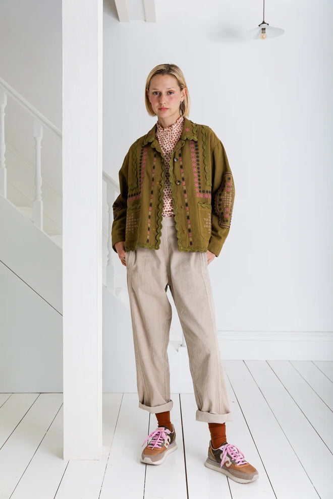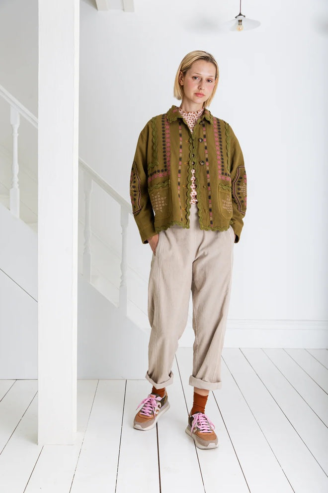 Style Details: The Genevieve Olive Jacket redefines everyday workwear with a playful, feminine twist! Crafted from soft olive cotton twill, slightly oversized, elevated by intricate multi-coloured embroidery, contrast tan twin-needle stitching, collar, button front, patch pockets, its full-length sleeves can be rolled for effortless ease, oversized, loose silhouette.