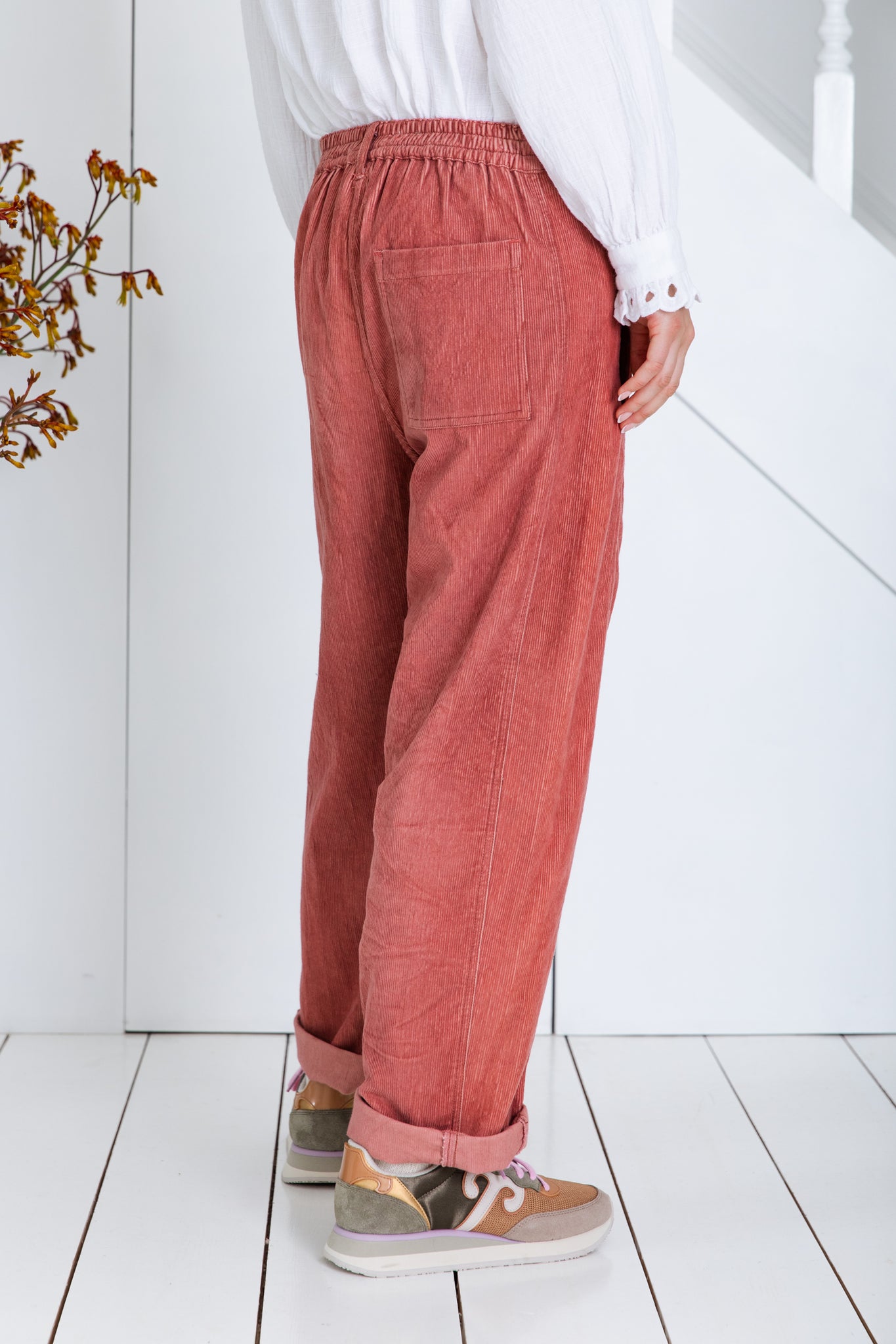 Style Details: Step into effortless elegance with the Nova Corduroy Trousers in a soft rose hue. Designed for modern versatility, these trousers feature a flattering straight silhouette enhanced by subtle pleat details at the back, the elasticated back ensures all-day comfort, while belt loops add styling flexibility, side pockets and a single back pocket, perfect for keeping essentials close. Whether paired with a crisp blouse for the office or a cosy knit for weekend outings, these corduroy trousers are a statement of refined, understated style.