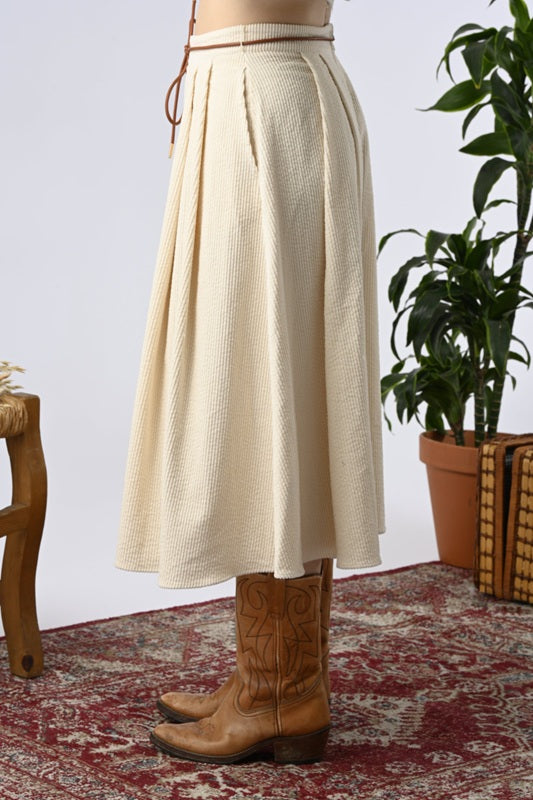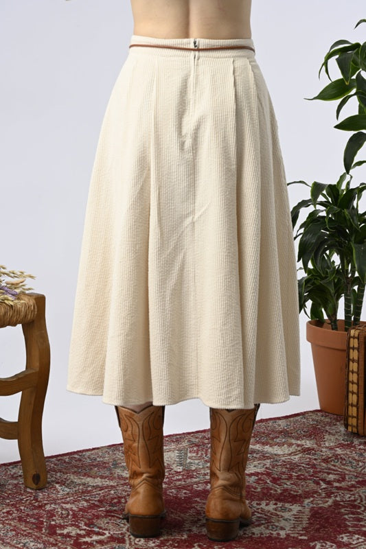 Style Details: Effortlessly elegant and endlessly versatile, the Waylon Corduroy Ecru Skirt is a modern essential for the woman who values both style and comfort! Its flowing, midi-length cut drapes beautifully to create a sleek, elongated silhouette, crafted from soft, high-quality corduroy, it closes neatly at the back with a subtle zip and is accented by a refined camel-and-gold belt that adds a touch of understated sophistication. Whether paired with ankle boots for a day at the office or dressed up for an evening out, the Waylon skirt adapts with ease — a timeless piece that embodies the perfect balance of chic design and everyday wearability.