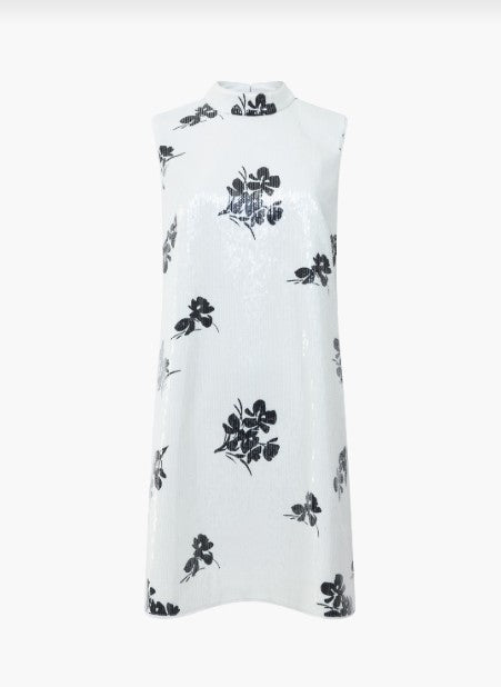 Style Details: A little sparkle goes a long way, and the Madeline Floral Sequin Dress proves it with effortless sophistication! Designed to dazzle, this mini dress features a striking monochrome floral print with all-over sequin embellishment, the high neckline and sleek sleeveless cut balance elegance with modern edge, while the open-back detail adds a touch of allure, fully lined for comfort and finished with discreet back button and zip fastenings. Madeline is the perfect blend of refined glamour and contemporary style—made to shine from cocktail hours to unforgettable evenings out!