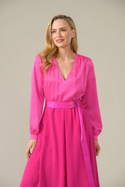 Style Details: The Aurelie dress in vibrant fuchsia is a striking blend of sophistication and modern femininity. Crafted with a flattering V-neckline, long sleeves finished with buttoned cuffs, delicate pleat detailing at the shoulders and waist enhances the silhouette, while a sleek belt adorned with a gold buckle adds a touch of refined glamour, fully lined for a smooth fit, and a concealed zip closure at the back, ensuring a seamless finish. This dress is perfect for a special occasion - pair with heels, a pretty headband and statement clutch for a fab look!