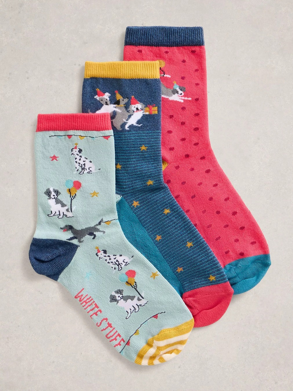 White Stuff 3 Pack Party Dogs Ankle Socks Blue MLT