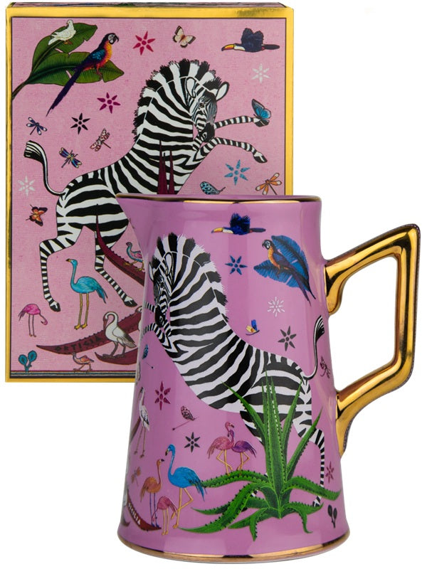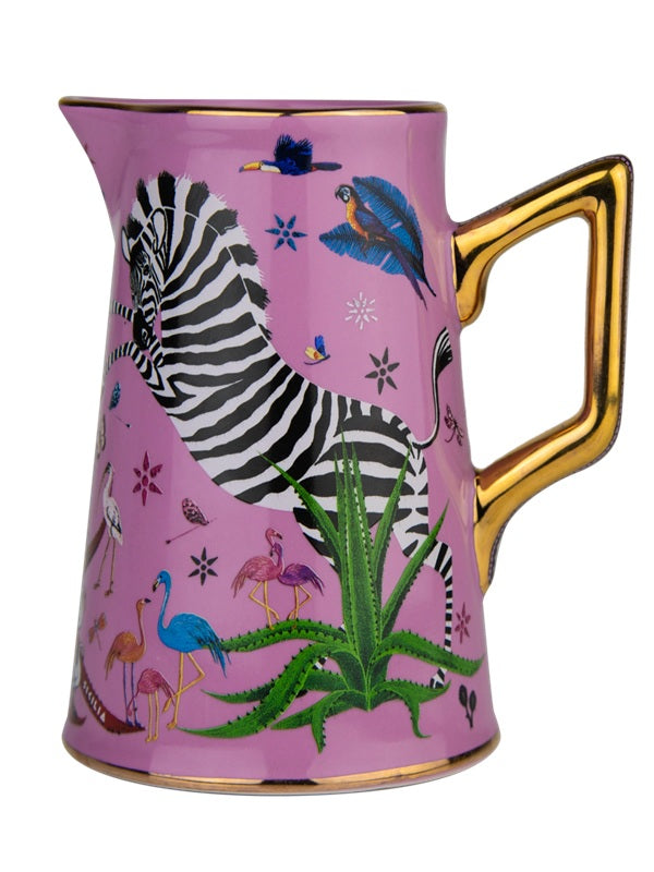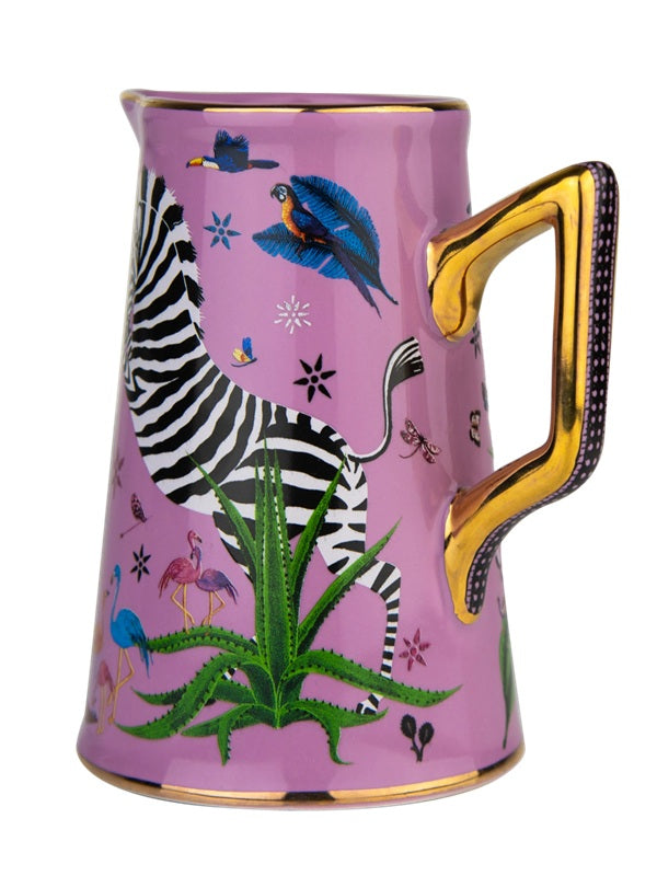 Style Details: A truly memorable gift and a timeless piece of art, this hand-decorated ceramic jug brings refined elegance to any home! Adorned with shimmering gold serigraphy, its intricate jungle motif unfolds beautifully against a vibrant pink background, infusing any setting with exotic charm. Whether showcased as a striking centrepiece, used to hold fresh blooms, or displayed as a decorative accent, this versatile jug captures both beauty and function in one.