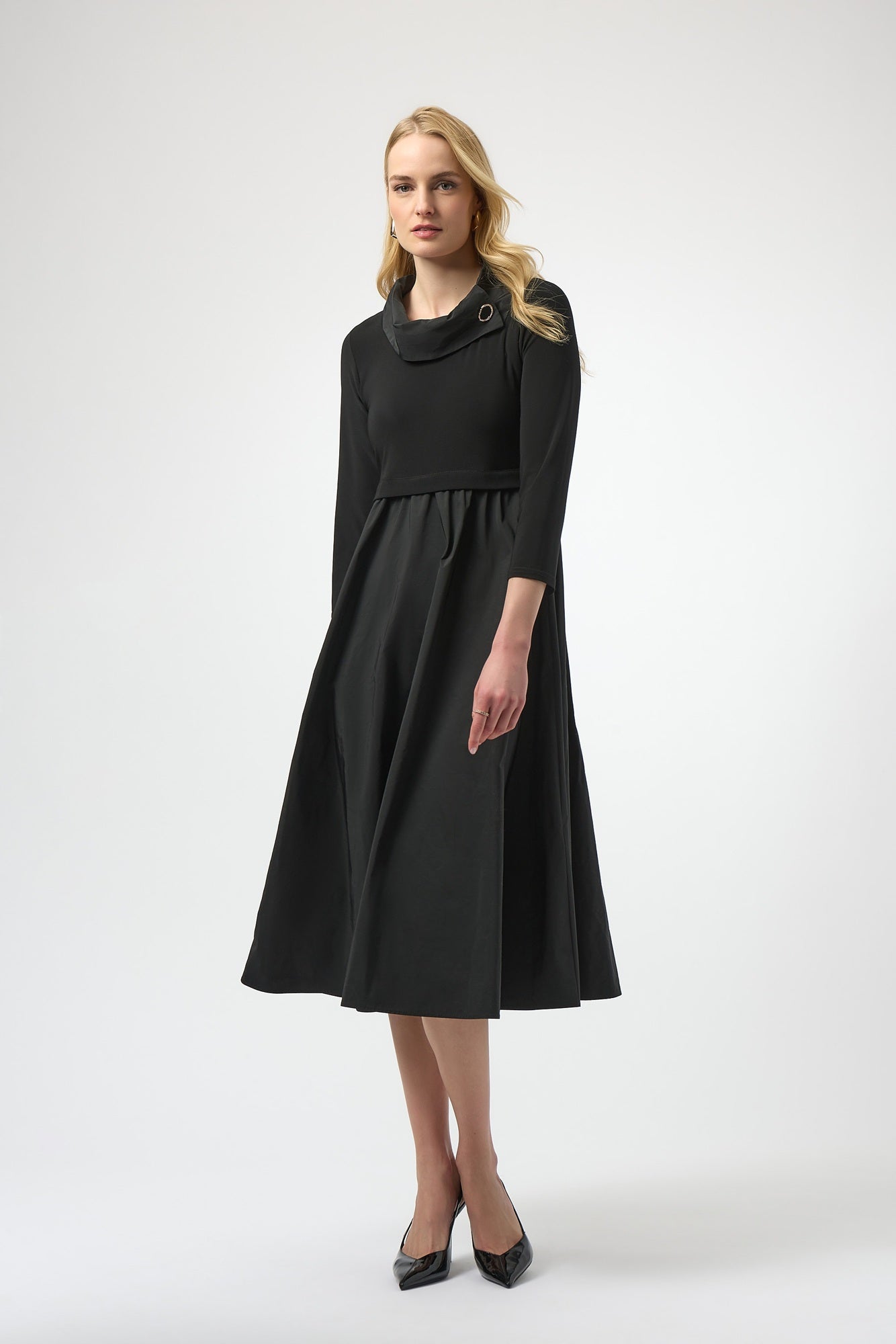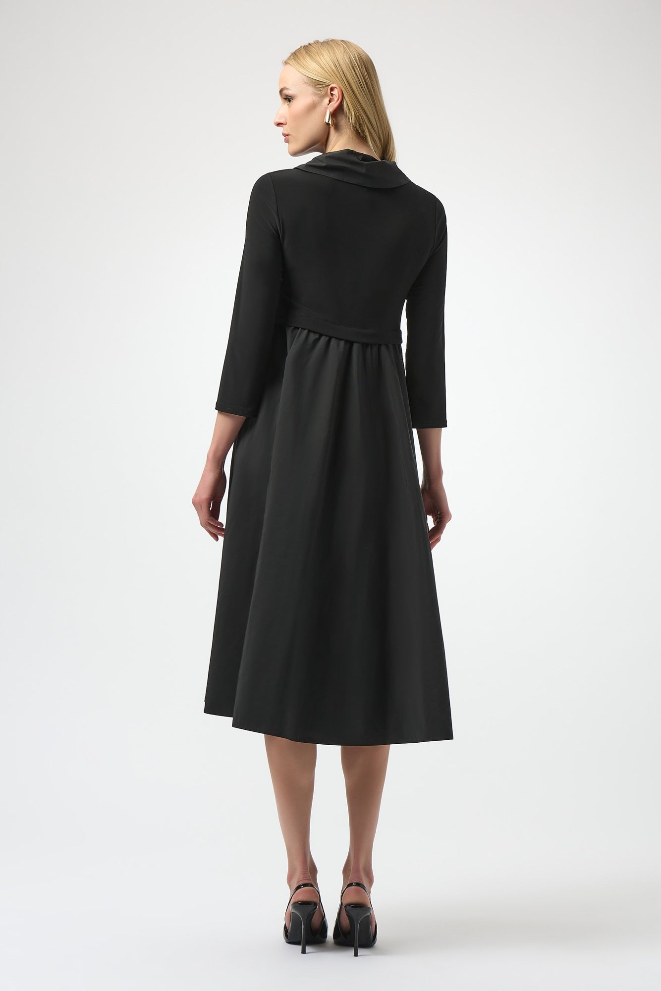 Style Details: Step into effortless elegance with this Black A-line dress by Joseph Ribkoff — where timeless design meets contemporary sophistication! Featuring a graceful cowl neck, a flattering belted waist, the 3/4 length straight sleeves and minimalist plain pattern exude understated charm, making it ideal for both elevated daytime looks and refined evening occasions. A wardrobe essential that transitions seamlessly, this dress is a true celebration of modern femininity.