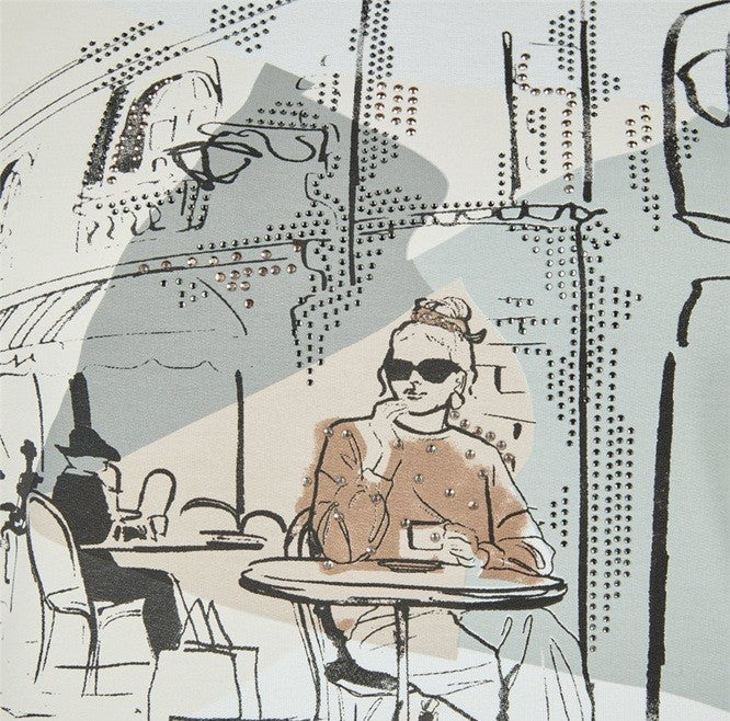 Style Details: This Rabe tee city print exudes modern sophistication with a touch of sparkle! Showcasing a dynamic cityscape print enhanced by shimmering rhinestone accents, round neckline, short sleeves, crafted from a luxuriously soft viscose-elastane jersey, ensures comfort, flexibility, and effortless style—perfect for elevating your everyday look with contemporary elegance.