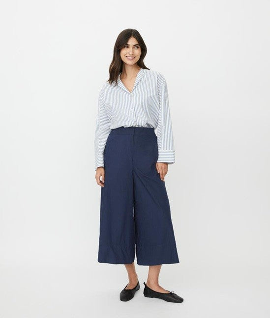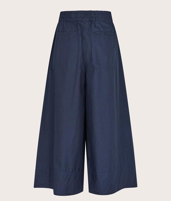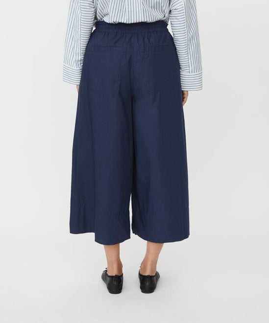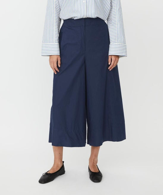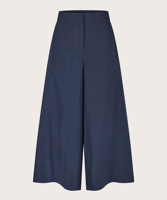 Style Details: Redefine everyday elegance with these navy cotton poplin trousers, created for those who value effortless style without compromising on comfort! Crafted from robust yet breathable cotton, sculptural drape that moves beautifully with you, wide cropped silhouette, and the elasticated back ensures a flexible fit that feels comfortable. Pair with a shirt or a lightweight knit to achieve a modern look that feels both relaxed and impeccably polished!