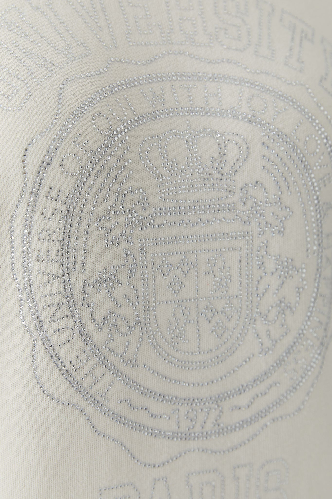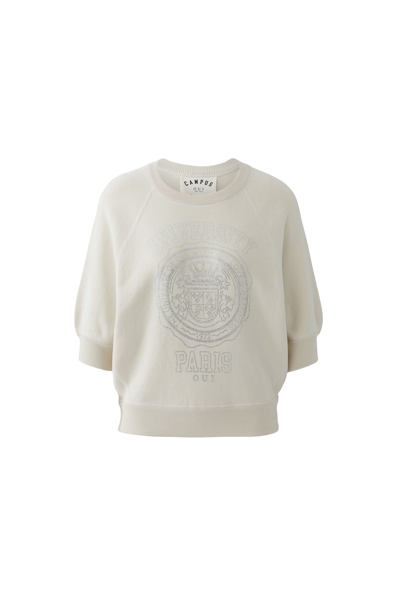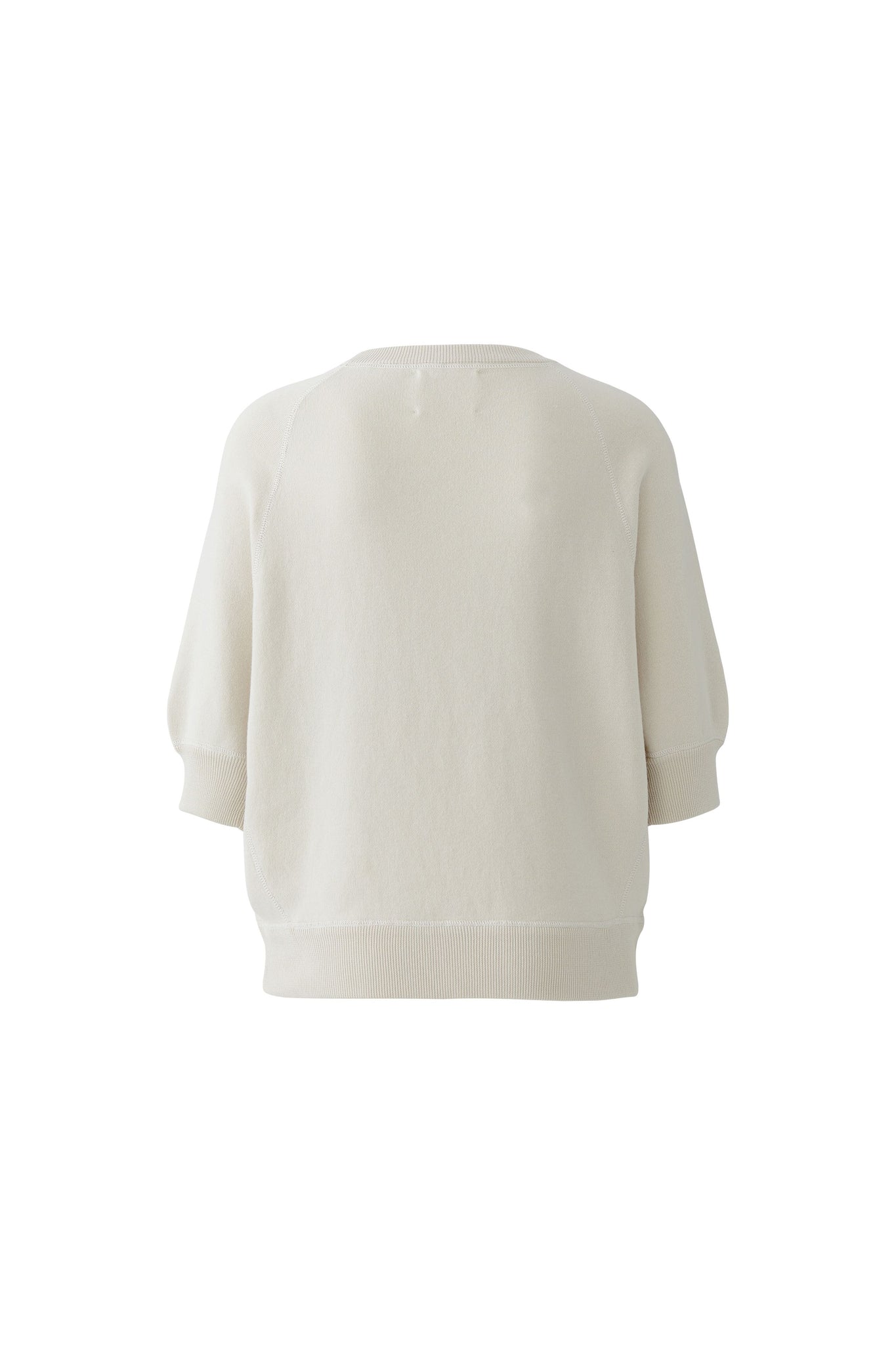 Style Details: Sporty style meets modern design in this knit cotton jumper in a fresh Whitecap tone. Crafted from pure cotton in a fine interlock knit, it features a distinctive shape with side inserts, a placed Hotfix College motif for a statement touch, casual fit, regular length, round neckline with sporty knitted cuffs, Milano-length sleeves in a low-set raglan shape, and accentuated seams finished with a sporty flatlock stitch for a clean, athletic look.