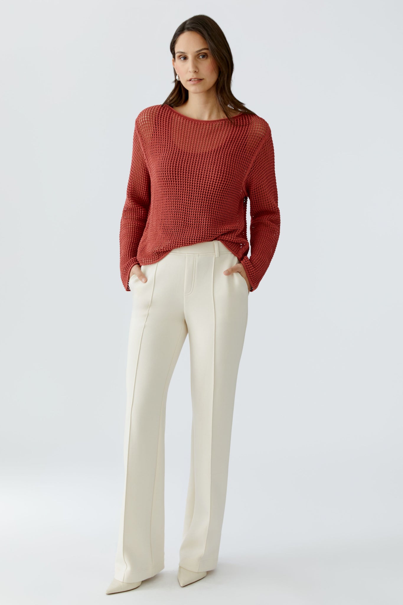 Style Details: Step into effortless elegance with these cream scuba jersey trousers by Oui. Tailored for a flattering fit with a subtle bootcut, they feature front seam details, in-seam pockets, and a comfortable elasticated waist. Sleek, versatile, and perfect for dressing up or down, these trousers are a modern wardrobe essential!