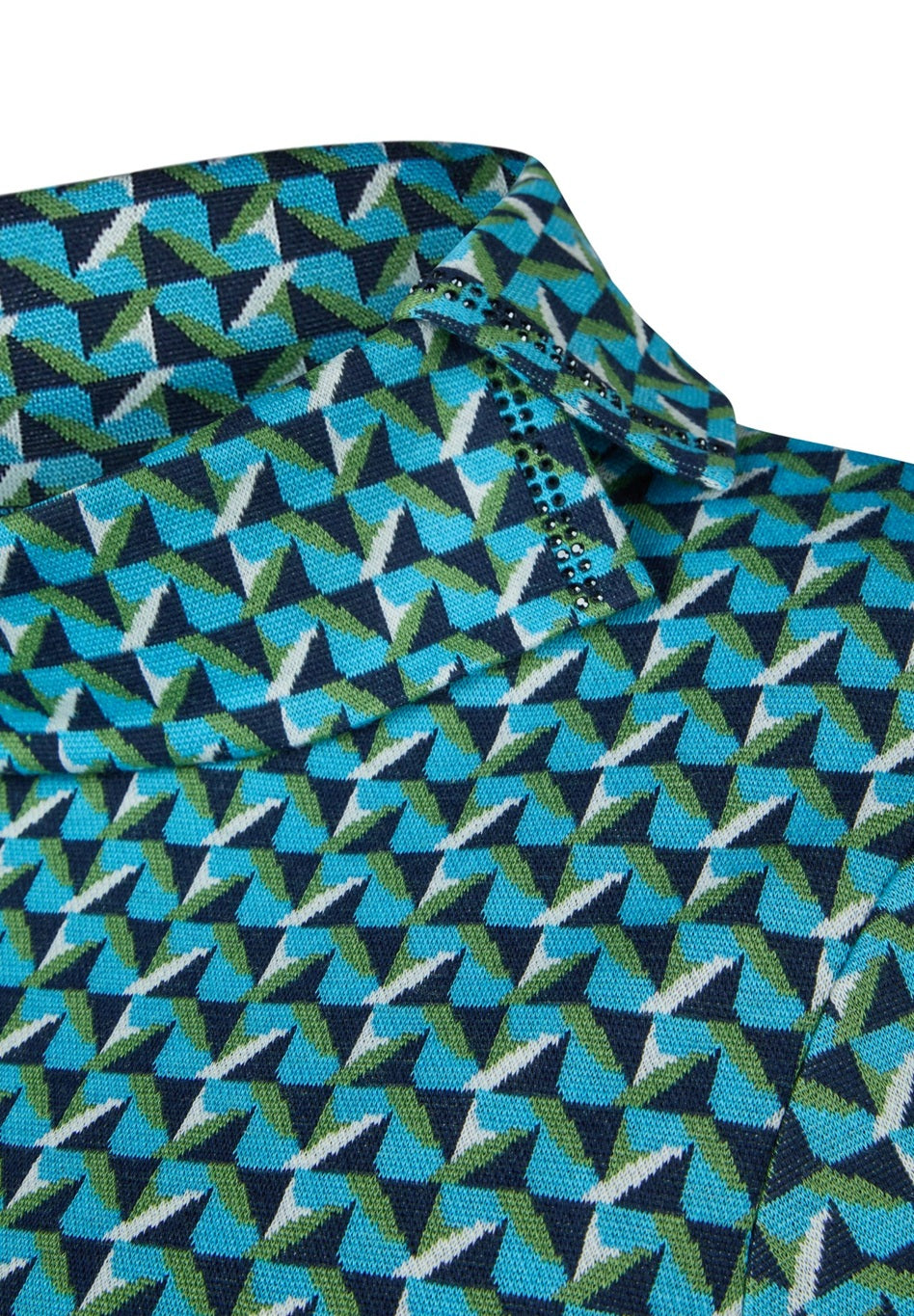 Style Details: Make a stylish statement with this knit shawl collar neck jumper showcasing a bold geo print, designed with 3/4 length sleeves, a flattering relaxed fit, the soft knit and refined collar detail make it an effortless choice for polished everyday dressing. Pair with our sporty navy pants and trainers for a casual look.