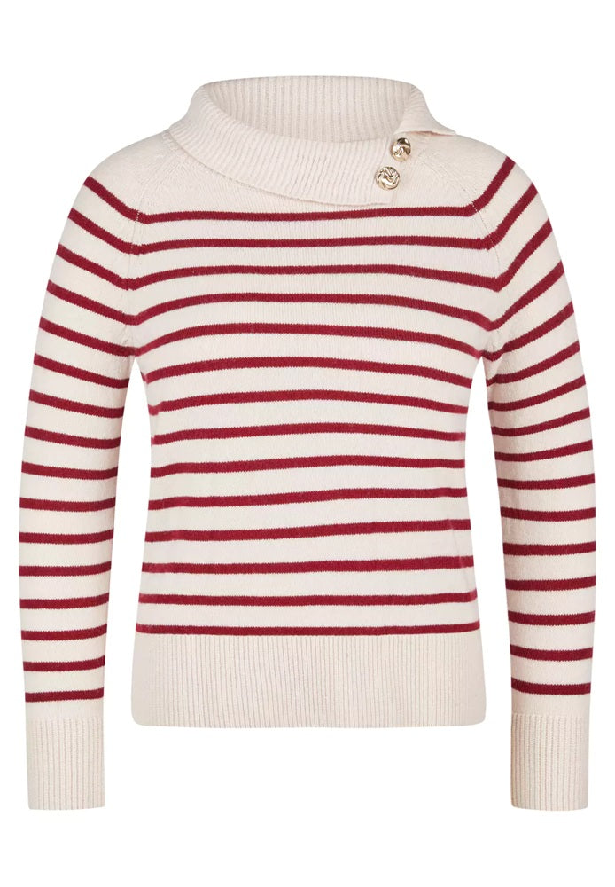 Style Details: Wrap yourself in effortless style with this chic knit striped jumper, crafted in warm cream and rich red tones, designed with a cosy high neckline accented by elegant side button details, the long sleeves and ribbed finishes add texture and comfort, making it the perfect piece for layering or wearing solo on crisp days.