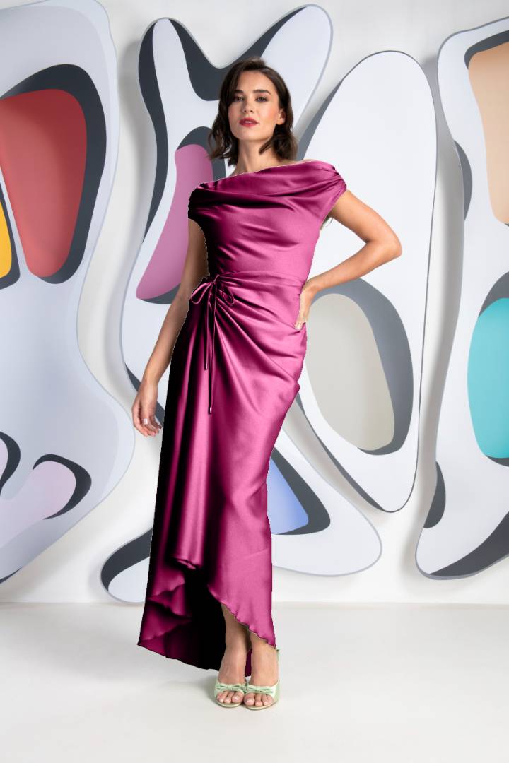 Style Details: Step into the spotlight with the Eugenia Dress by Kevan Jon-a chic masterpiece that blends timeless sophistication with modern allure! Crafted in sumptuous deep plum satin, off-the-shoulder gown showcases an asymmetric draping, a cinched waist that sculpts the silhouette to perfection, the fluid satin fabric cascades with effortless grace, and striking high-low hemline. Whether gracing a winter wedding, gala, or black-tie soirée, this dress radiates refined glamour with a dramatic edge! Available in other colours.