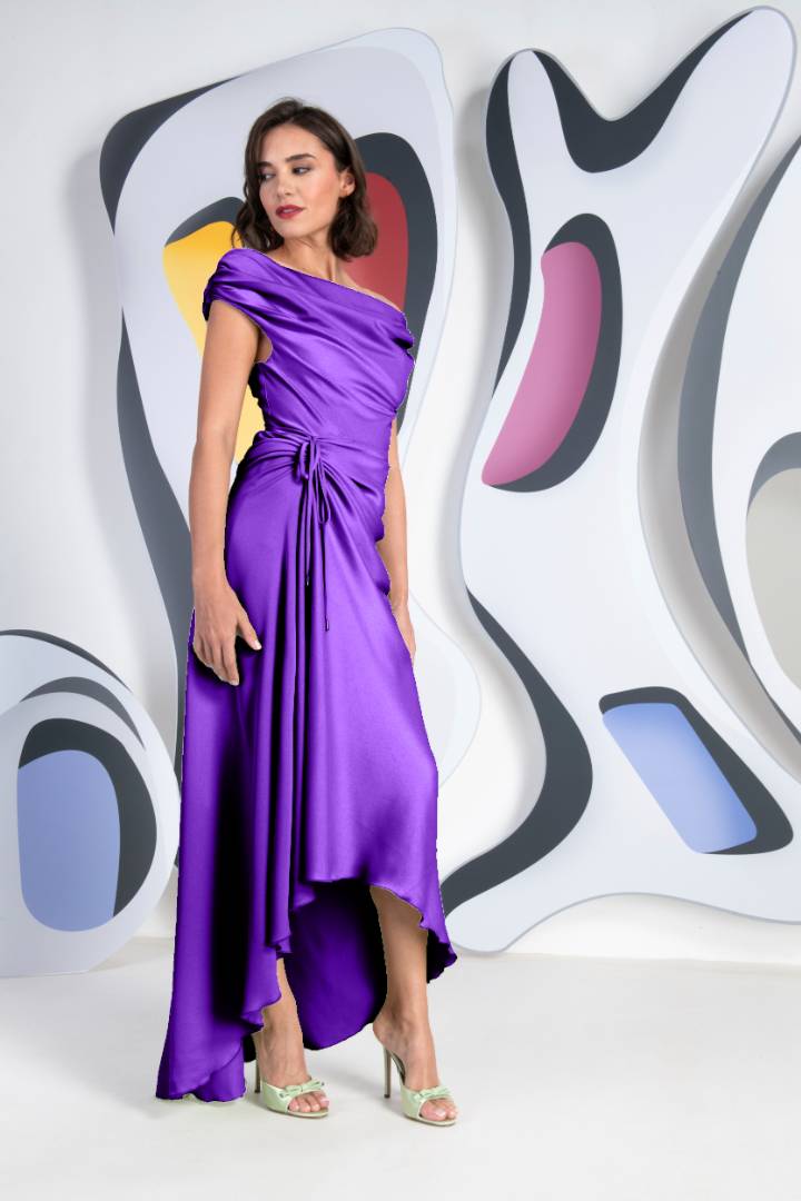 Style Details: Step into the spotlight with the Eugenia Dress by Kevan Jon-a chic masterpiece that blends timeless sophistication with modern allure! Crafted in sumptuous deep plum satin, off-the-shoulder gown showcases an asymmetric draping with tie effect, a cinched waist that sculpts the silhouette to perfection, the fluid satin fabric cascades with effortless grace, and striking high-low hemline. Whether gracing a wedding, gala, or black-tie soirée, this dress radiates refined glamour with a dramatic edge! Available in other colours.